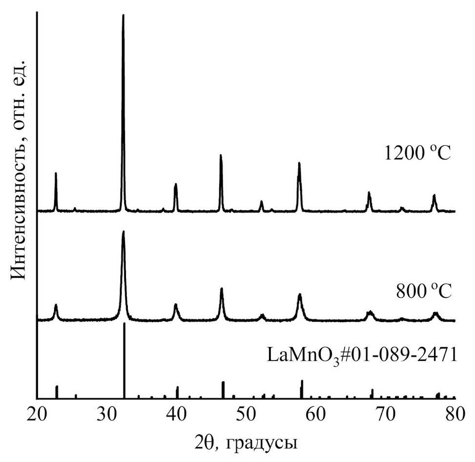 Прокаленный порошок подвергали сухому помолу в механической ступке в течение 1 ч и прессовали в виде параллелепипедов с примерными размерами 5×4×15 мм под давлением 2 т/см2. В зависимости от содержания марганца в оксиде финальную термообработку образцов вели при разных температурах и временных выдержках, что обсуждено далее.