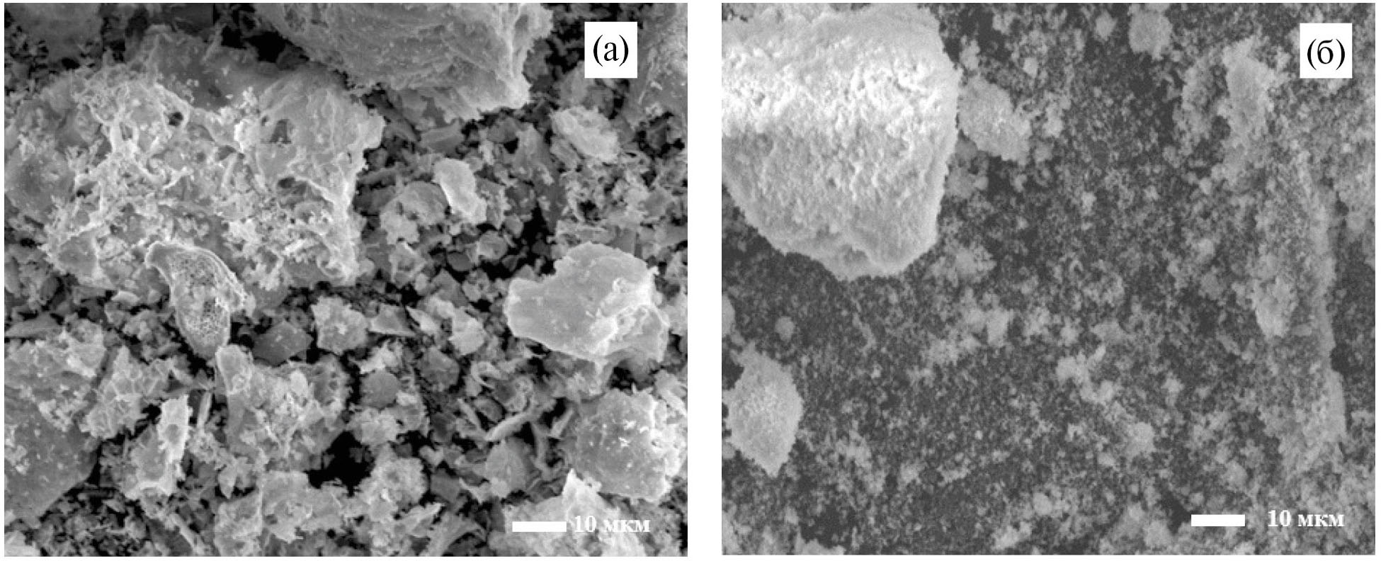 Рис. 4. Микрофотографии полученного порошка La0.9Sr0.1Sc0.95Mn0.05O3 – δ после стадии сжигания (а), после помола (б).