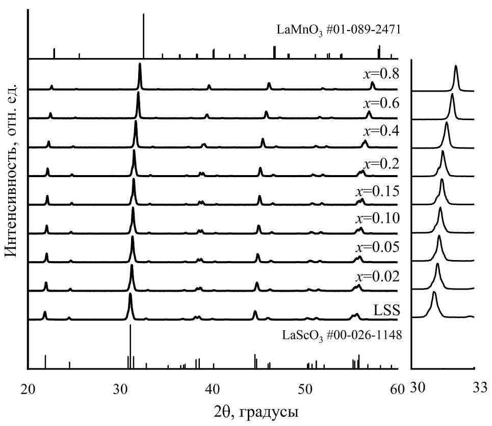 Согласно фазовому анализу, составы с диапазоном х = 0.02–0.2 соответствуют скандату лантана #00–26–1148 по базе данных PDF ICDD (рис. 6), а при допировании более х = 0.4 – манганиту лантана #01–089–2771. Все составы имеют структуру перовскита с орторомбическими искажениями. Пространственная группа Pnma сохраняется во всем диапазоне допирования. Структура перовскита образуется уже после стадии предварительного отжига и сохраняется после спекания при температурах 1650 оC для х = 0.02–0.05, 1600 оC для х = 0.1–0.2 и 1500 оC для х = 0.4–0.8.