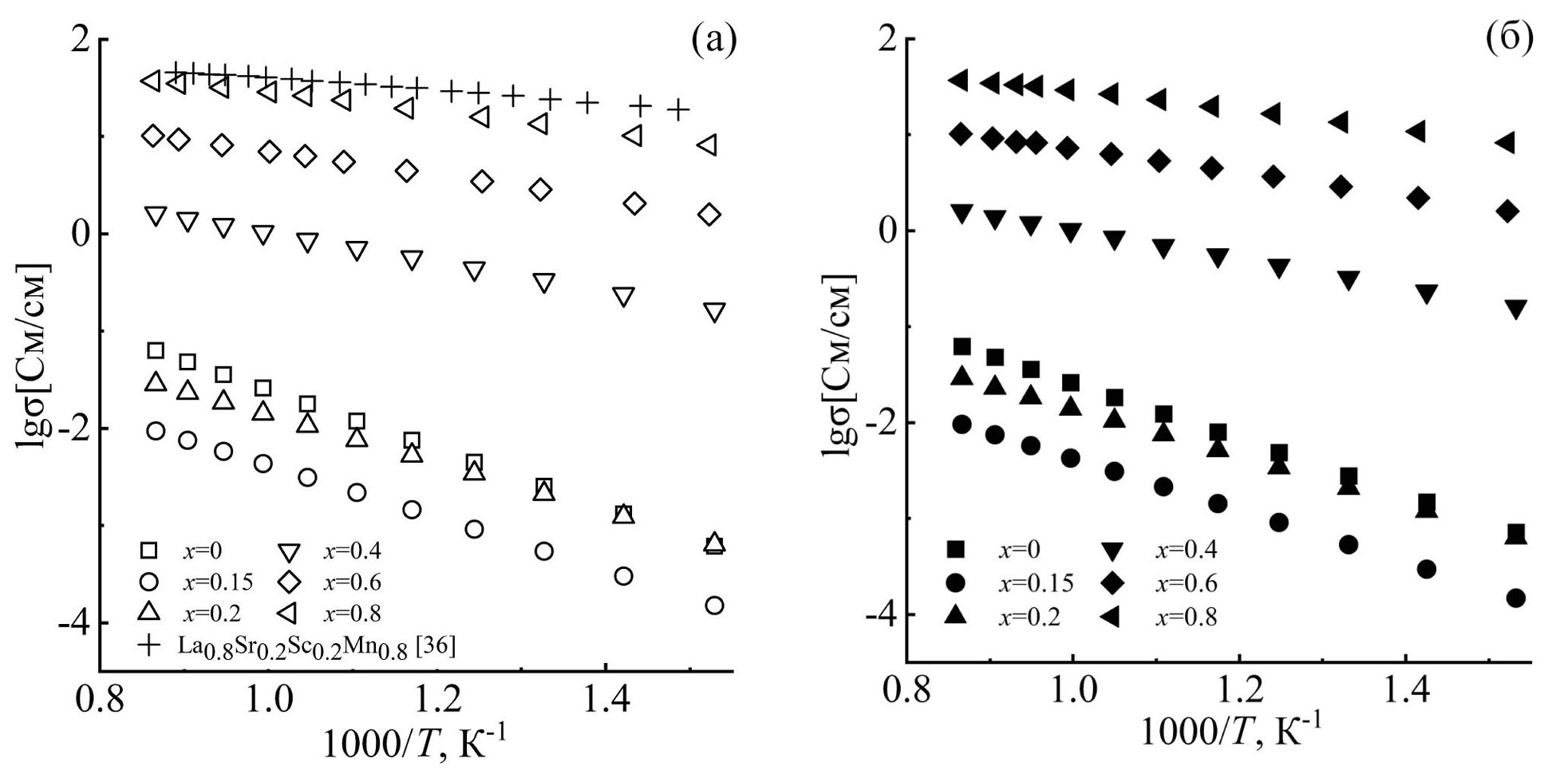 Авторами [35] представлены исследования электропроводности La0.8Sr0.2Sc0.2Mn0.8O3 – δ в атмосфере воздуха (рис. 8а, обозначены крестиками). Видно, что данные по уровню и характеру проводимости сопоставимы, небольшие расхождения связаны с влажностью газовой фазы, которую авторы не указывают, а также за счет отличия в концентрации стронция, что формирует большую дефектность структуры.