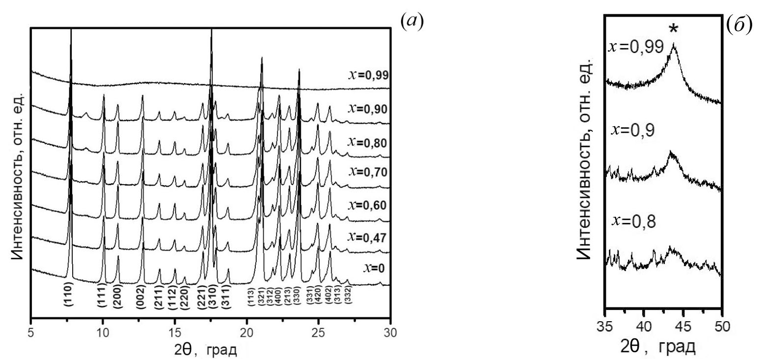 Из рис. 1 видно, что рефлексы тетрафторбората трибутилметиламмония присутствуют на дифрактограммах вплоть до состава с х = 0.9. Информация о кристаллической структуре (н-C4H9)3CH3NBF4 отсутствует в базах данных. Для уточнения положения пиков для нескольких вариантов пространственных групп кристаллической решетки был использован метод Паули [30]. Наилучшее соответствие было получено для пространственной группы P42/ncm с параметрами решетки a = b = =15.94 Å; с = 13.79 Å. Более точную информацию о кристаллической решетке, в том числе координаты атомов, можно было бы получить на монокристалле (н-C4H9)3CH3NBF4. Работы в этом направлении ведутся в настоящее время. Заметного уширения рефлексов, относящихся к фазе соли, на дифрактограммах не наблюдается (рис. 1а). Рефлексов других фаз не обнаружено (за исключением непроиндицированного рефлекса при 2θ = 7.5 град), что свидетельствует об отсутствии химического взаимодействия между компонентами композита. Заметное снижение интенсивности дифракционных пиков соли с ростом х и полное их исчезновение при х = 0.99 указывают на аморфизацию соли при гетерогенном допировании.