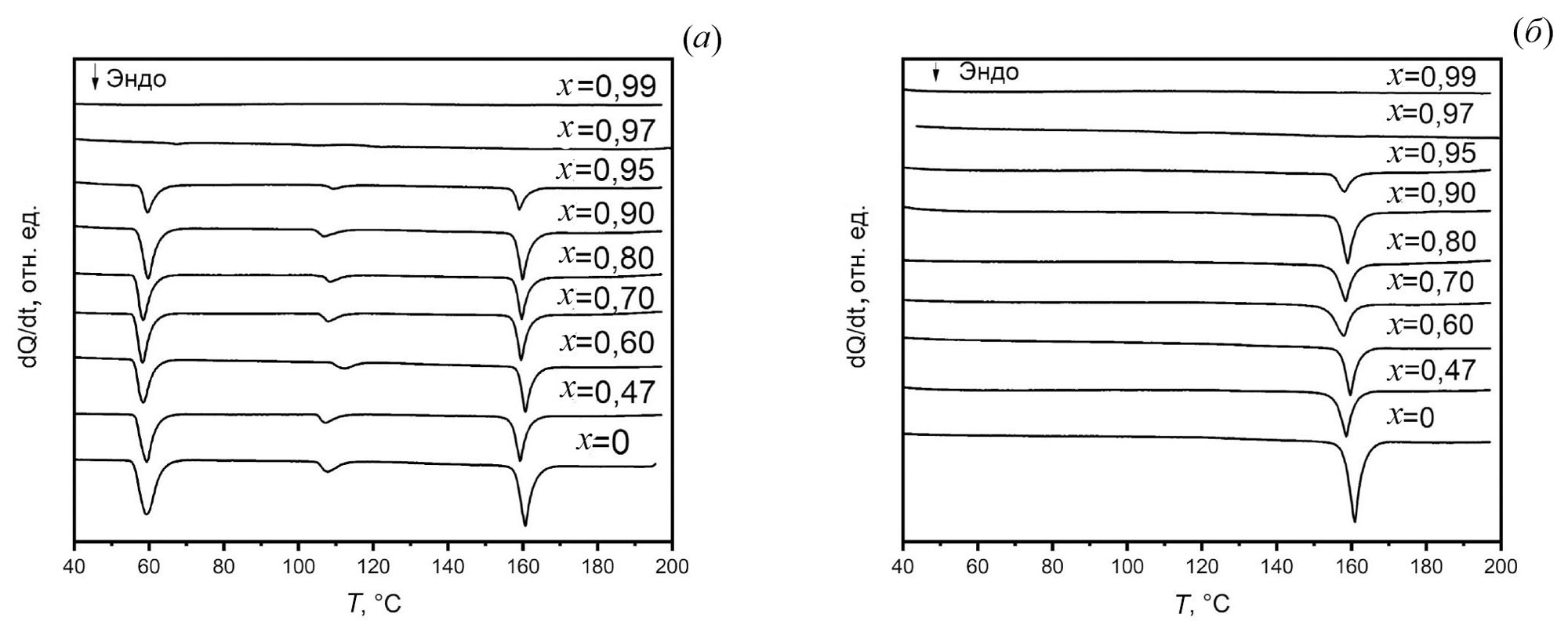 Рис. 2. Кривые ДСК для композитов (1-x) (C4H9)3CH3NBF4 – xCНА, полученных при первом (а) и втором (б) нагреве.