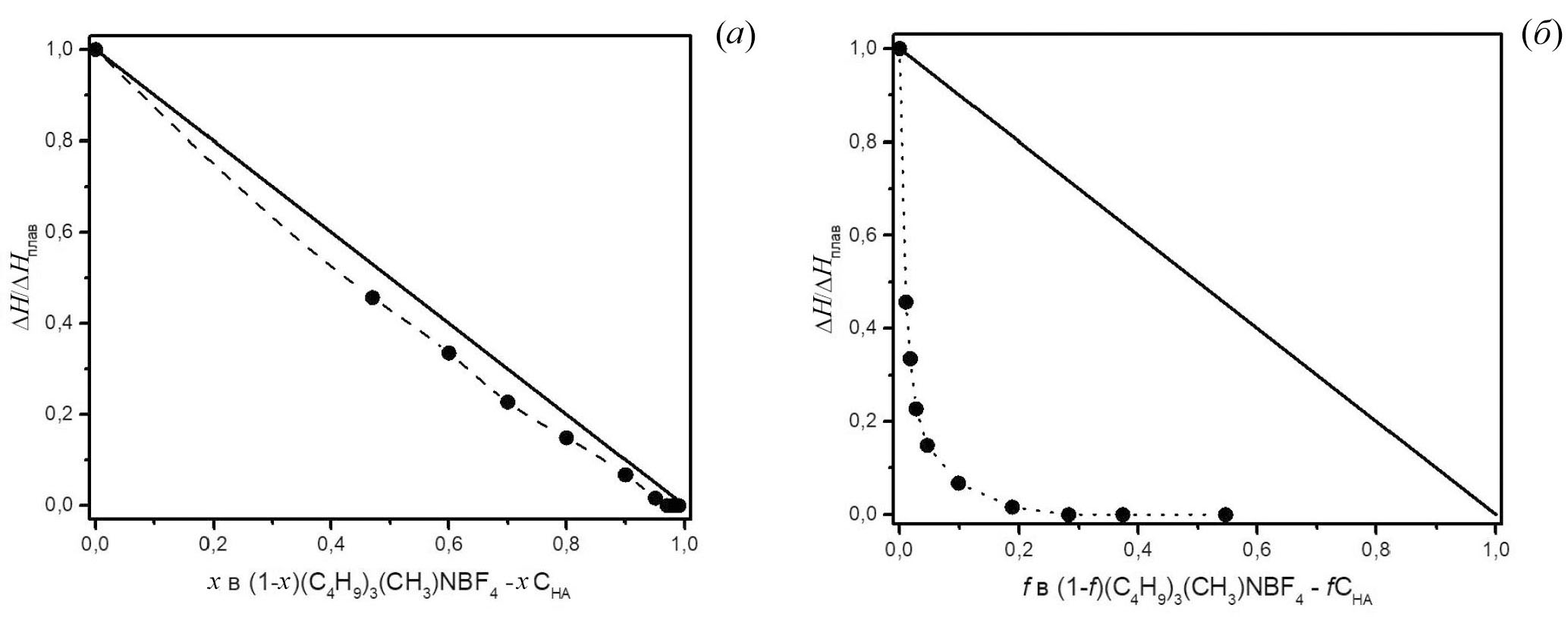 Рис. 3. Экспериментальные значения энтальпии плавления тетрафторобората трибутилметиламмония в композитах (1– x) (C4H9)3CH3NBF4 – xCНА (символы) в сравнении с ожидаемой для механической смеси соль + наноалмазы (линия) в зависимости от мольной (а) и объемной (б) доли наноалмазов.