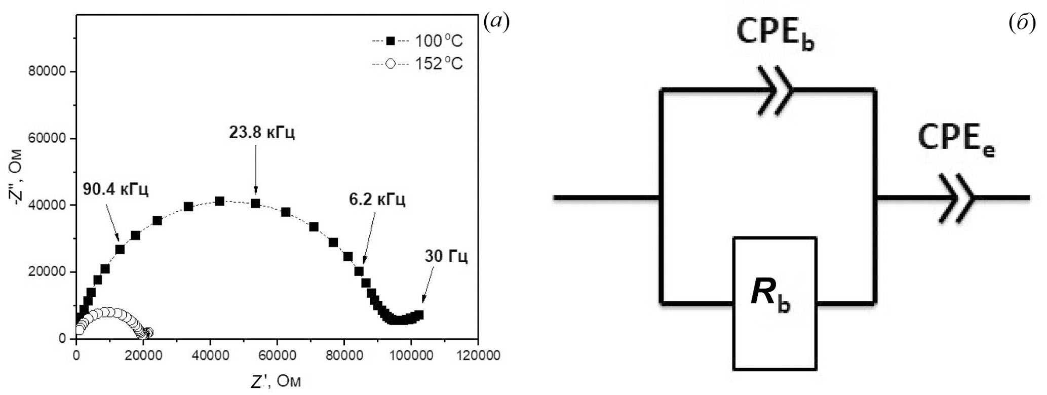 Рис. 4. Годографы импеданса композитов 0.01(C4H9)3CH3NBF4 – 0.99CНА, измеренные при температурах 100 и 152 °С. Эквивалентная схема, используемая для интерпретации данных, где Rb – объемное сопротивление образца, CPEb и CPEe – элементы постоянной фазы, описывающие геометрическую емкость образца и электродный импеданс, соответственно (б).