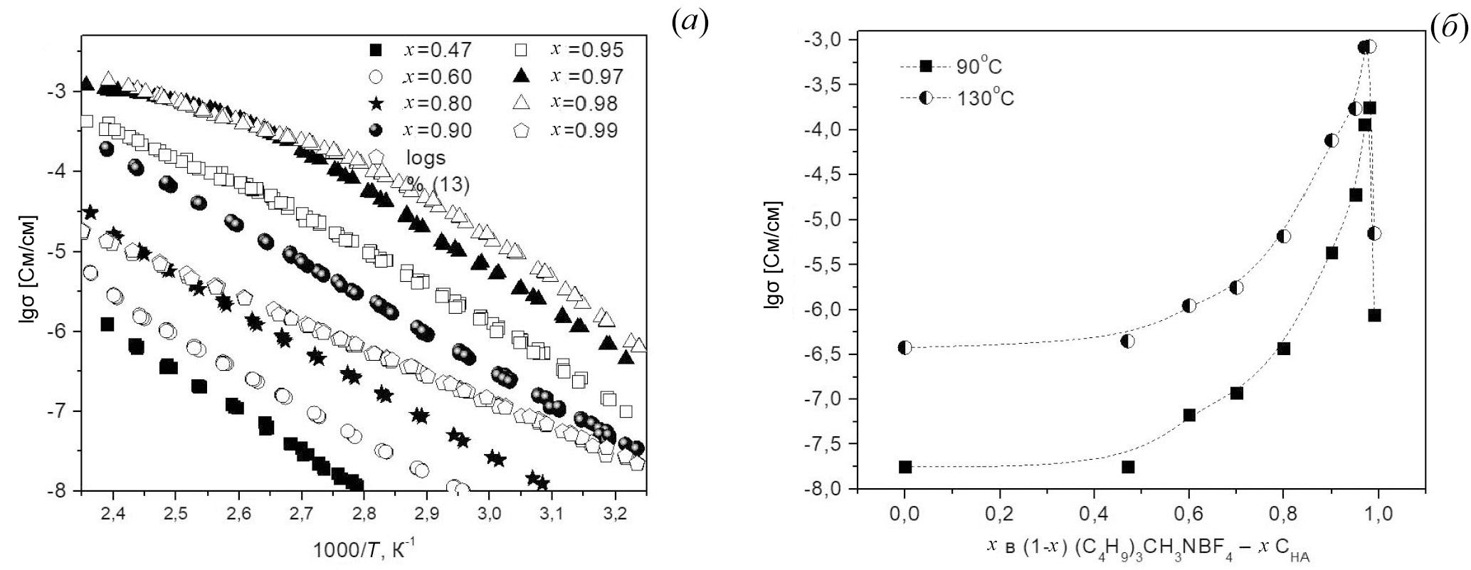 Температурные зависимости электропроводности композитов (1 – x) (C4H9)3CH3NBF4 – xCНА (0.47 ≤ x <1) представлены на рис. 5а.