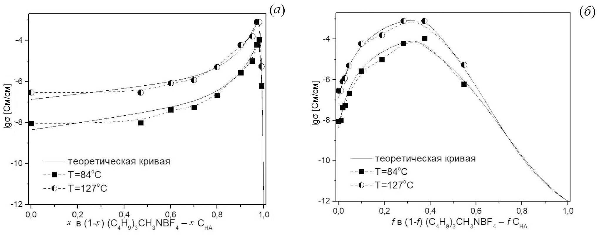 Рис. 6. Экспериментальная (точки) и теоретическая (сплошная линия) концентрационные зависимости удельной проводимости композитов (1 – х) (C4H9)3CH3NBF4 – xCНА от мольной доли (а) и объемной доли (б) наноалмазов для температур 84 и 127 oС.