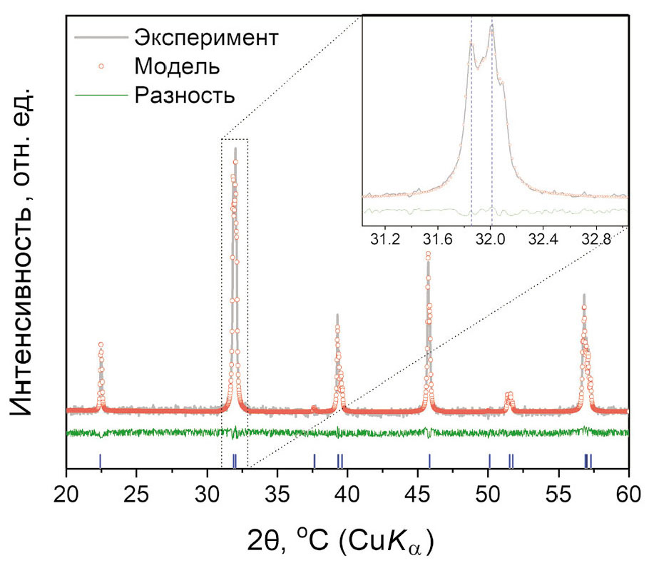 Полноту протекания реакции оценивали с помощью рентгенофазового анализа порошка SC с использованием дифрактометра D8 Advance (Bruker, Германия), используя высокоскоростной детектор LynxEye (СuKα-излучение). Данные были получены в диапазоне 2θ от 20 до 60о с шагом 0.02о и временем накопления 0,5 с. Расшифровку данных дифракции проводили с помощью программы Топаз.
