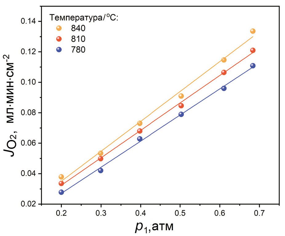 Для описания процессов кислородного транспорта в работе была использована оригинальная полуэмпирическая модель [18, 20]. В рамках предложенной модели данные кислородной проницаемости могут быть представлены в виде зависимости потока кислорода, прошедшего через мембрану, от разности давлений p1n – p2n, где p1, p2 – парциальное давление кислорода с питающей и проницаемой стороны мембраны соответственно. В описанном эксперименте значение p2 << p1, что позволяет упростить выражение для JO2 и не учитывать парциальное давление кислорода с проницаемой стороны. Значение степени n = 1 в данном случае было найдено при подгонке экспериментальных данных под предложенную модель при использовании метода наименьших квадратов [18]. На рис. 4 показаны результаты исследования кислородной проницаемости мембран в виде зависимости удельного потока кислорода (JO2) на выходе из мембраны от давления в питающем потоке при различных температурах. Полученные результаты указывают на достаточно скромную производительность мембраны, что может косвенно свидетельствовать о диффузионном режиме кислородного обмена в мембране.