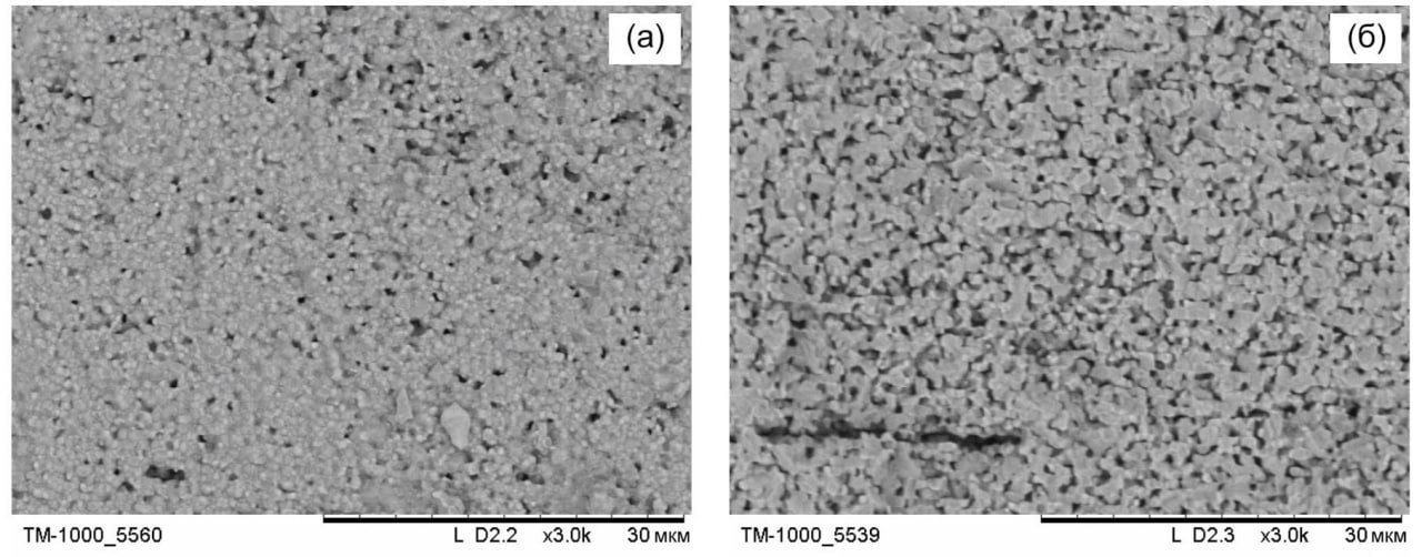 Рис. 1. Микрофотографии композитной анодной заготовки NiO/GDC, полученной методом: литья (а), 3D-печати (б).