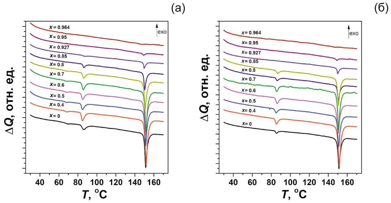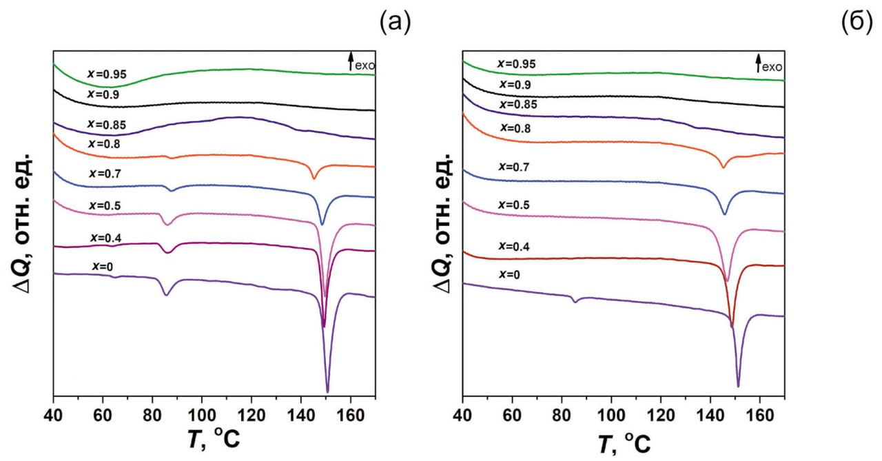 Из результатов исследования термических свойств композитов (1-x)[(CH3)(C4H9)C5H10N]BF4 – xAl2O3 методом дифференциальной сканирующей калориметрии (рис. 1) видно, что на первом нагреве в области низких температур (до 80 оС) при x > 0.8 наблюдается широкий пик, обусловленный удалением воды, сорбированной на поверхности оксида. При температурах ~80 и 150 оС наблюдаются эндотермические эффекты, обусловленные фазовым переходом в разупорядоченное состояние и плавлением соответственно, которые с увеличением концентрации оксида уменьшаются и при x ≥ 0.85 полностью исчезают. На втором нагреве тепловой эффект при T = 80 оС отсутствует, что может быть вызвано “замораживанием” высокотемпературной фазы, при этом тенденция уменьшения теплового эффекта плавления (и полное его исчезновение при x ≥ 0.85) с ростом концентрации оксида сохраняется, также наблюдается смещение температуры плавления в сторону низких температур, что обусловлено размерным эффектом [9]. Наблюдаемый эффект характерен для систем типа “ионная соль – оксид” и может быть связан с переходом ионной соли в аморфное состояние.