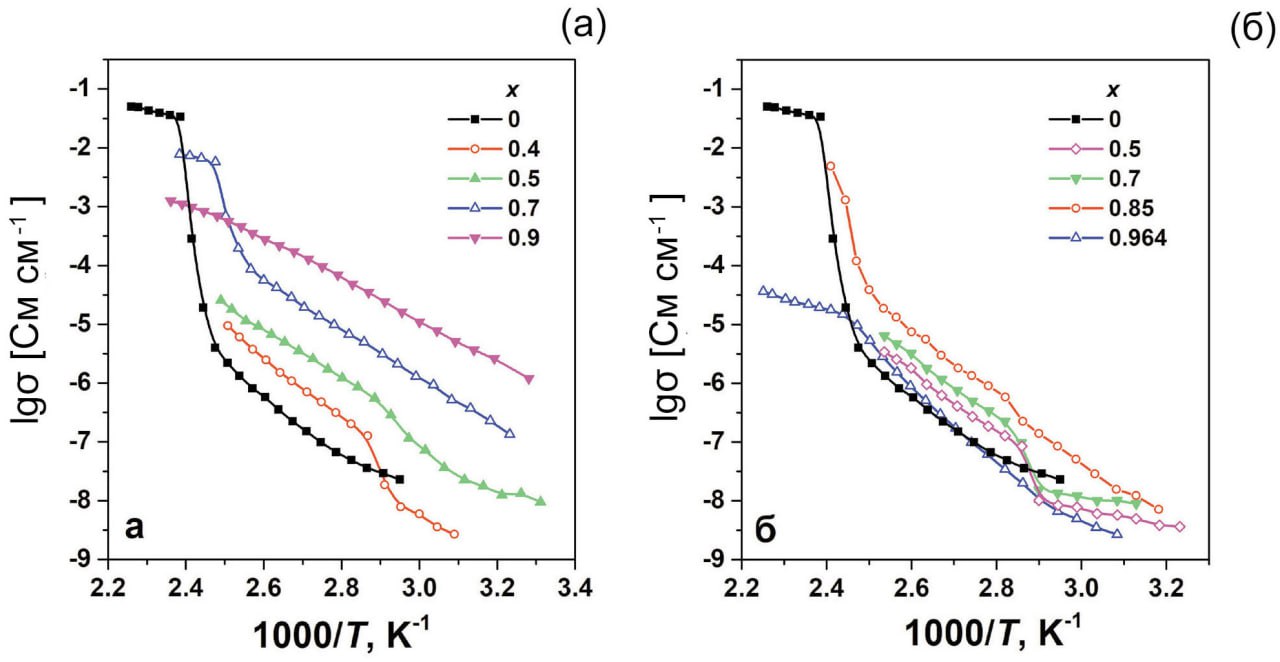 Рис. 3 . Температурная зависимость проводимости композитов (1-x)[(CH3)(C4H9)C5H10N]BF4–xAl2O3 (а) и (1-x) [(CH3)(C4H9)C5H10N]BF4–xSiO2 (б).