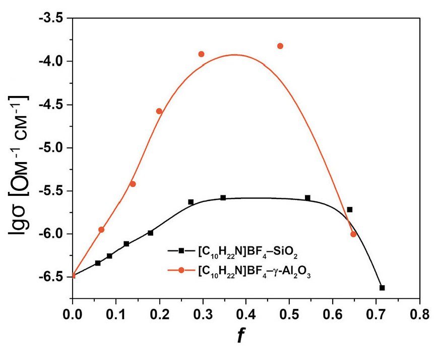 В композитных твердых электролитах типа “ионная соль – оксид” ионный перенос реализуется вдоль интерфейса. Известно, что наиболее сильный эффект от гетерогенного допирования ионной соли нанокристаллическими оксидными добавками наблюдается для композитов, в которых в результате поверхностного взаимодействия происходит аморфизация ионной соли. Концентрационная зависимость ионной проводимости в подобных системах представляет собой куполообразный вид. Максимум проводимости в композитных твердых электролитах приходится на составы с наибольшим количеством межфазных границ. Как правило, это реализуется при объемном соотношении компонентов, близком к 1/1. Ввиду того, что гетерогенные добавки имеют разную молярную массу, то для корректного сравнения влияния природы допанта необходимо сравнивать концентрационные зависимости проводимости исследуемых композитов в зависимости от объемной доли оксида. На рис. 4 приведены изотермы проводимости в зависимости от объемной концентрации гетерогенной добавки. Для соединений, содержащих γ-Al2O3, концентрационная зависимость имеет вид, характерный для композитов, в которых ионный перенос реализуется вдоль границ раздела фаз, благодаря аморфизации ионной соли на поверхности гетерогенного допанта. Гетерогенное допирование н-метил-бутил-пиперидиния тетрафторбората оксида алюминия приводит к резкому увеличению удельной проводимости. Максимум ионной проводимости приходится на композиты с fAl2O3 ~0.5 об. доли γ-Al2O3. В случае композитов с SiO2, при введении гетерогенного допанта не наблюдается резкого увеличения ионной проводимости. Вплоть до fSiO2 ~0.27–0.30 об. доли концентрационная зависимость имеет практически линейный вид. При концентрациях оксида кремния fSiO2 > 0.3 и до 0.55 об. доли значения ионной проводимости практически не изменяются и зависимость проводимости от концентрации представляет собой плато. При концентрациях fSiO2 > 0.55 происходит резкое снижение проводимости.