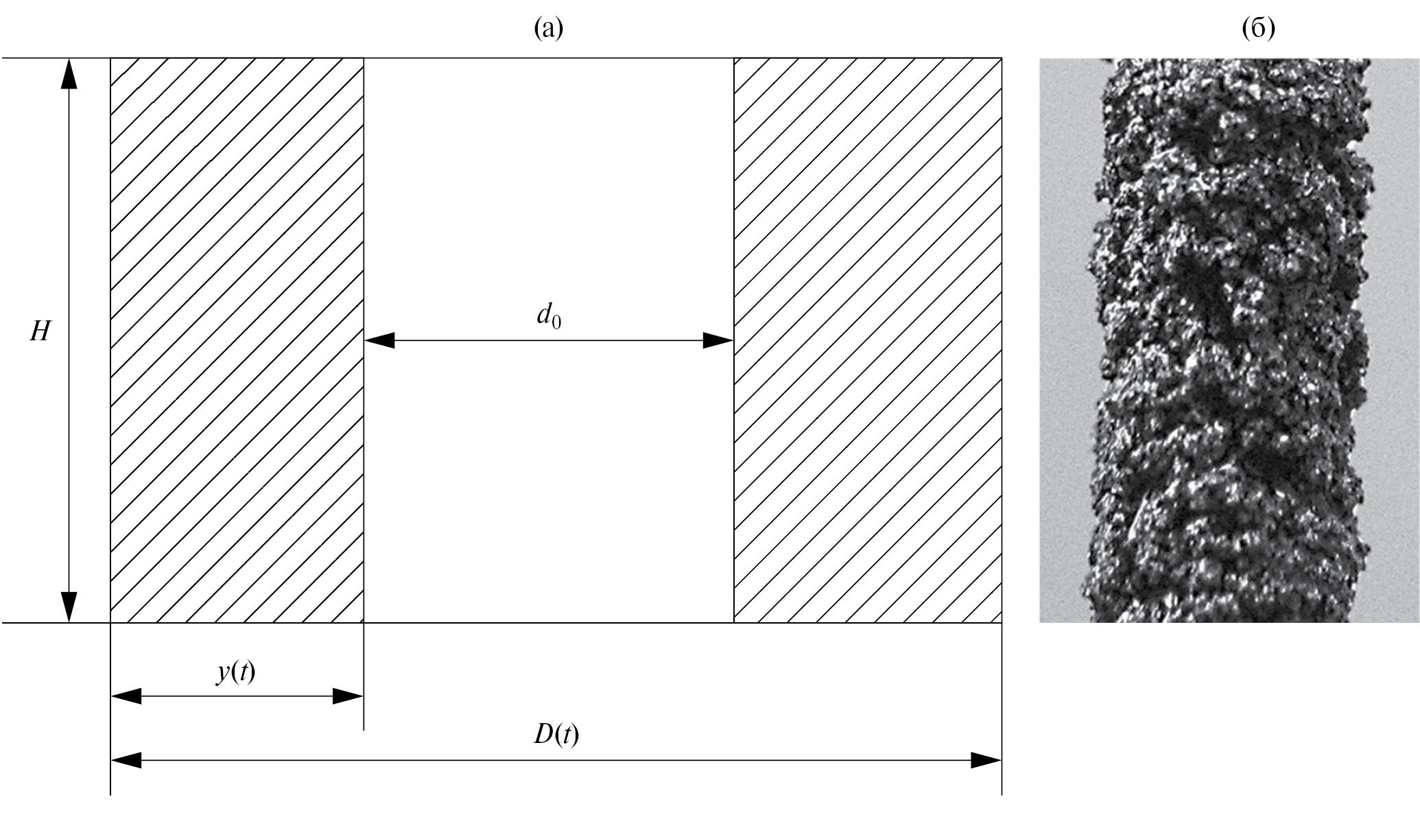 Рис. 1. Схема (а) и фото (б) цилиндрического электрода высотой H со слоем рыхлого осадка толщиной у(t); d0 – начальный диаметр электрода; D(t) – диаметр электрода с осадком в момент времени t.