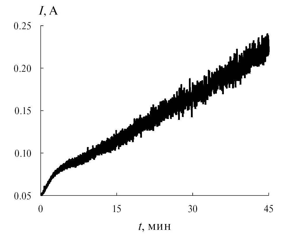 В промышленности металлические порошки получают электролизом при задании постоянного тока, превышающего предельный ток. При этом форма и размер дендритных частиц зависят от величины задаваемого тока и времени роста осадка [15]. Однако в ходе гальваностатического электролиза меняются скорости процессов восстановления металла и водорода из-за развития поверхности осадка и, как следствие, снижаются диффузионные ограничения по доставке разряжающихся ионов. Вследствие этого образуются осадки с неоднородными свойствами.
