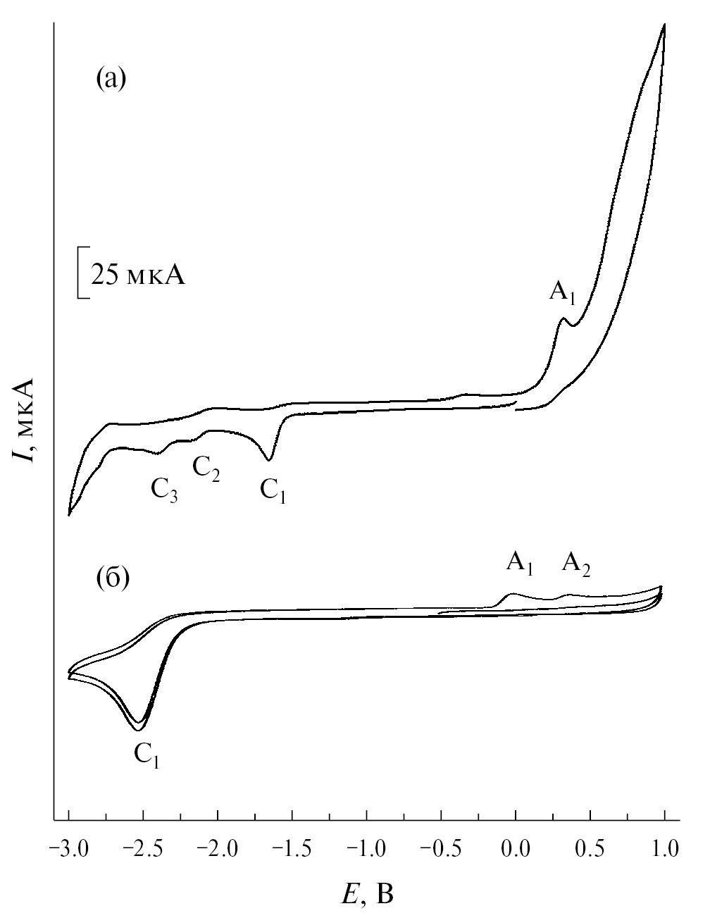 Исследования электрохимических свойств комплекса [Co(Ph2PCH2P(Ph)2 PPPPP(Ph)2CH2PPh2)]BF4 (1) проводились с использованием метода циклической вольтамперометрии (ЦВА) в ДМФА с использованием Bu4NBF4 в качестве фонового электролита. Циклическая вольтамперограмма (ЦВА-кривая) комплекса 1 (рис. 2, кривая (а)) имеет 3 пика необратимого восстановления C1–C3 с потенциалами пиков EpC1 = –1.65, EpC2 = –2.17 и EpC3 = –2.40 В соответственно, а также пик необратимого анодного окисления A1 с потенциалом пика EpА1 = 0.36 В (табл. 2).