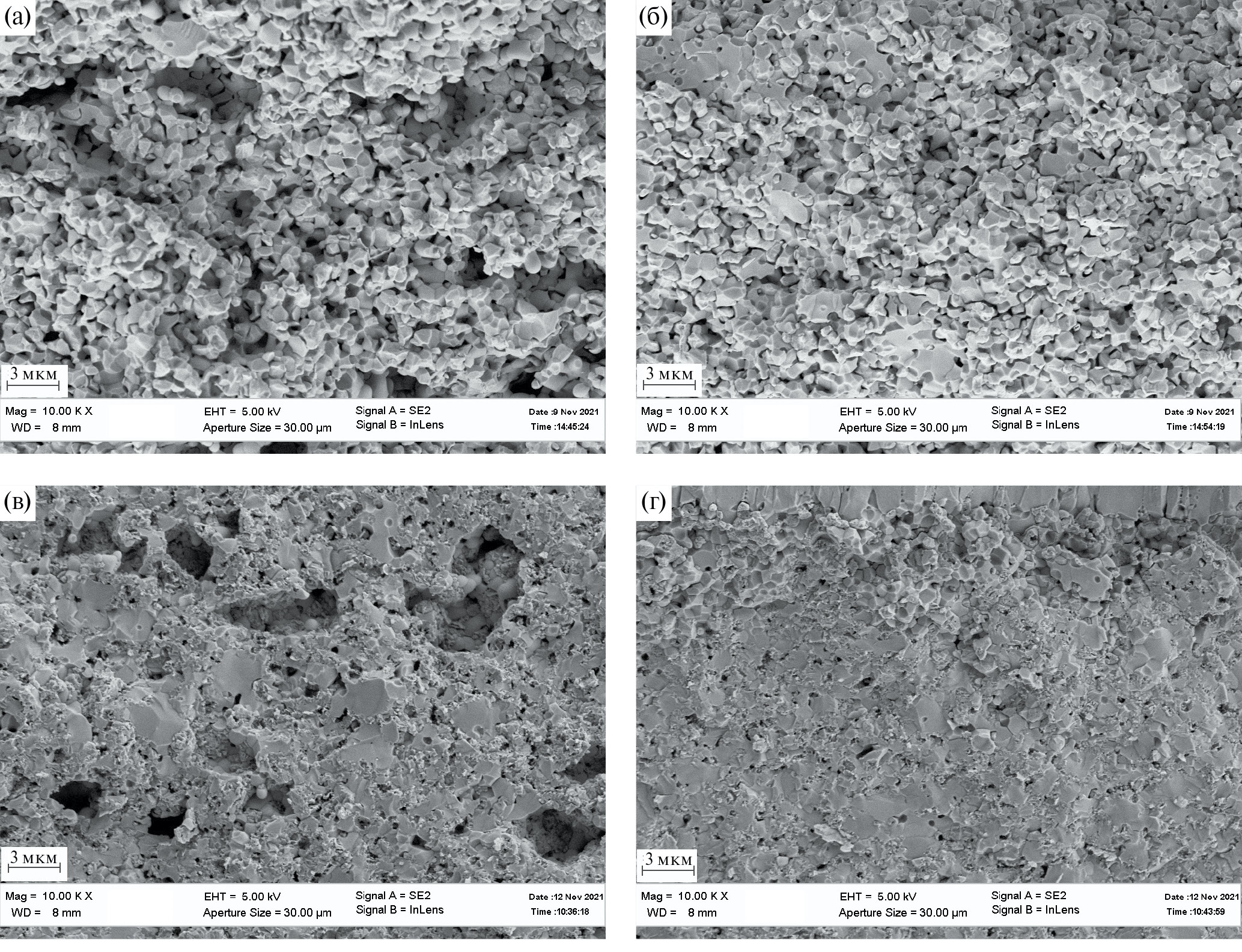 Изображения поперечного сечения спеченной анодной подложки, полученные методом сканирующей электронной микроскопии, представлены на рис. 1. На верхних изображениях (а, б) показано поперечное сечение токосъемного слоя, а на нижних (в, г) – функционального. Левые изображения (а, в) демонстрируют микроструктуру подложки после изготовления – до восстановления, а правые (б, г) – после проведения процедуры восстановления. В окисленном состоянии (рис. 1а) отчетливо видны зерна 8YSZ, размер которых не превышает 3 мкм. В восстановленном состоянии (рис. 1б, 1г) отчетливее проявляются зерна Ni – их размер не превышает 1 мкм. В структуре токосъемного слоя присутствует открытая пористость, образованная введением рисового крахмала. Толщина анодной подложки после спекания составила 420 мкм. Толщина токосъемного слоя, являющегося механически опорным слоем в структуре ТОТЭ, составила 400 мкм. Функциональный слой имеет толщину около 20 мкм, отсутствие необходимости изготовления данного слоя с большей толщиной определяется тем, что активная реакционная толщина анода составляет около 10 мкм [10].