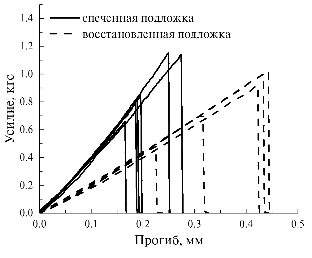 Нагрузочные кривые пластин, измеренные до и после восстановления, представлены на рис. 2. Видно, что увеличение пористости пластин, которое наблюдается при их восстановлении (рис. 1б, 1г), не приводит к потере механической стабильности пластин, наоборот – увеличивается их гибкость. Дополнительная пористость, образованная крахмалом, приводит к увеличению предельной нагрузки, при которой происходит разрушение анодных подложек, на 10–15% [13]. Предельное усилие, необходимое для разрушения подложки после ее восстановления, составляет около 1 кгс, а соответствующий прогиб – около 0.45 мм.