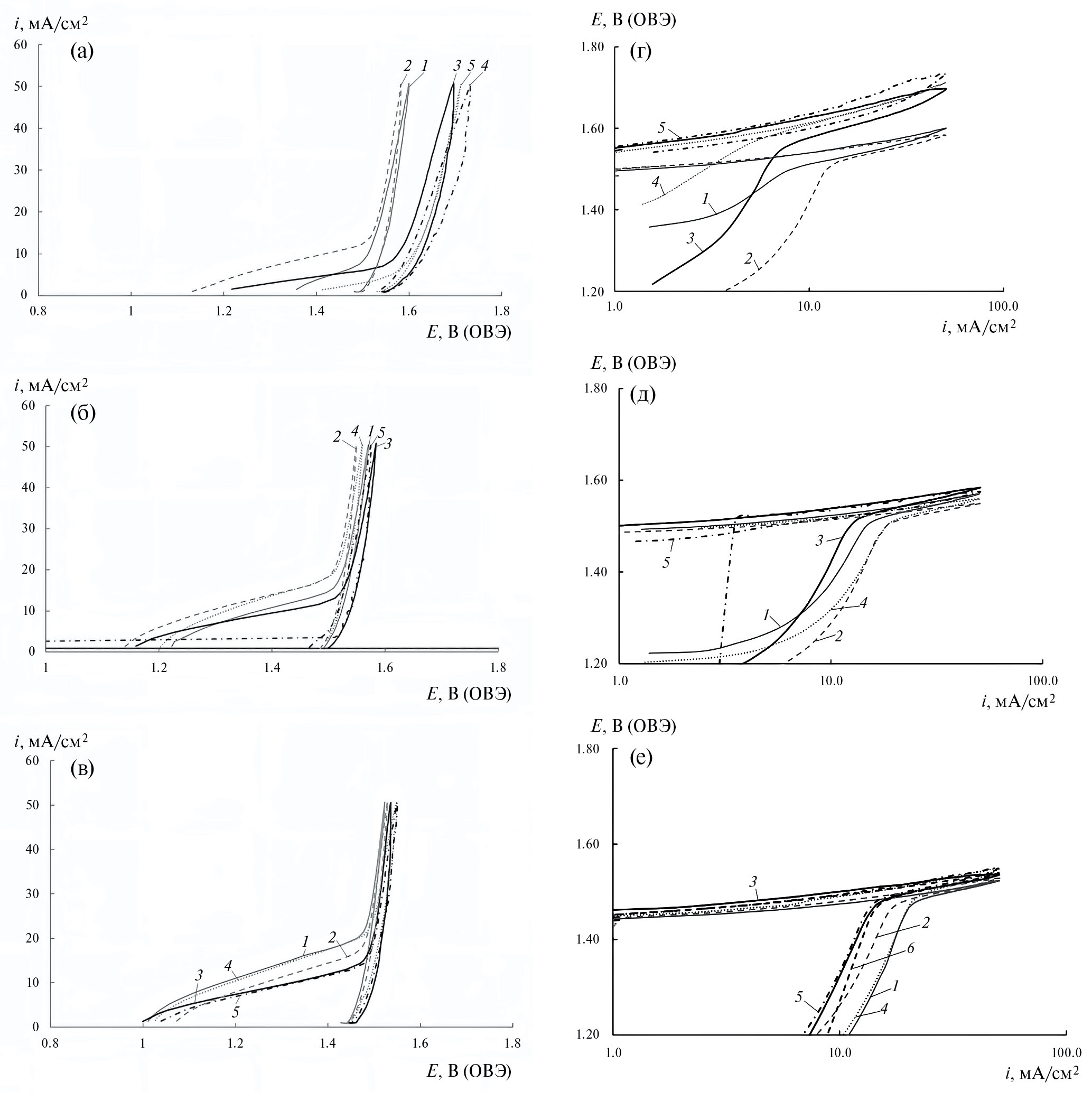 Для определения свойств каталитических композиций анода в реакции выделения кислорода для каждого образца измерялись электрохимические характеристики: