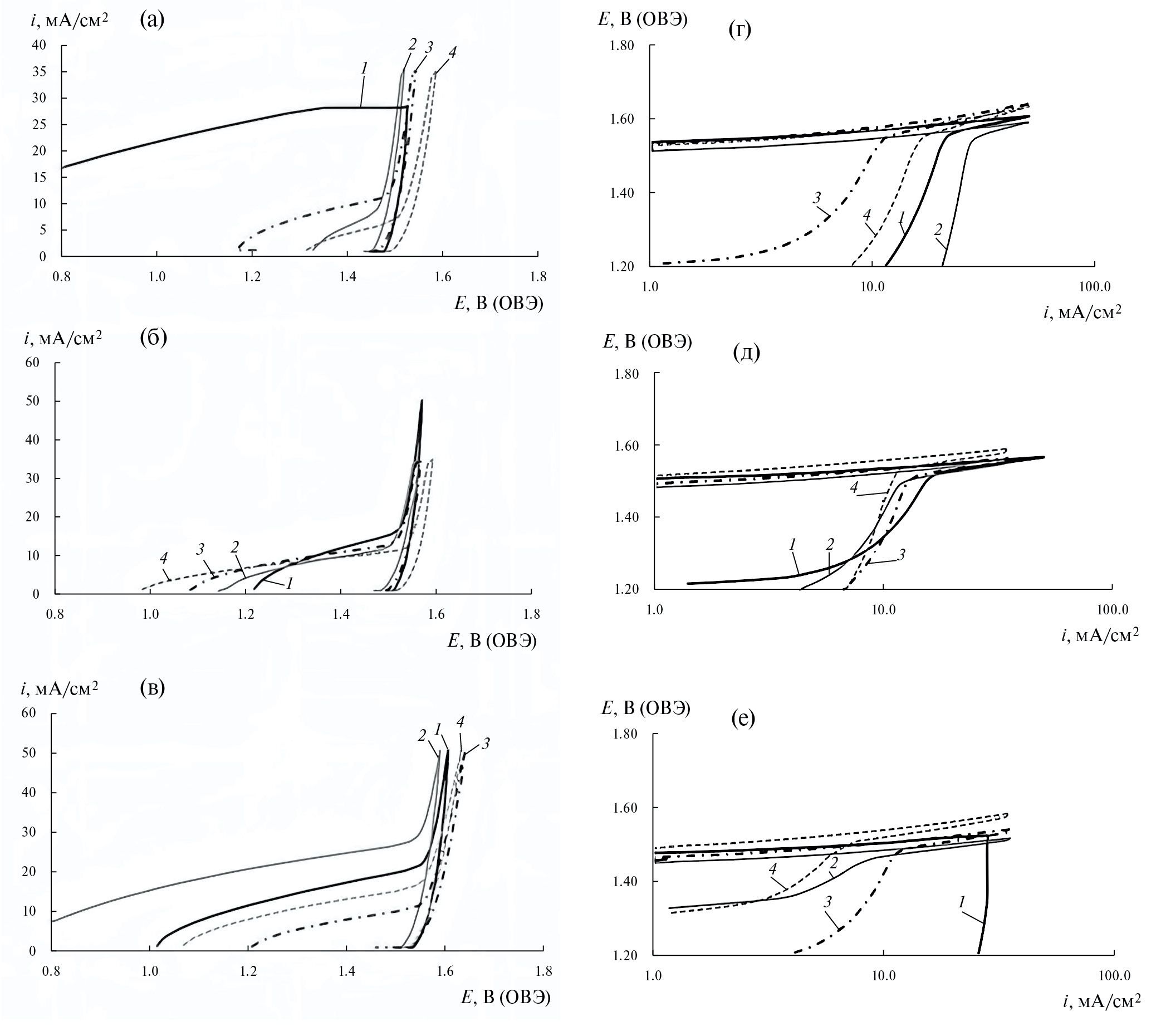 Рис. 4. Вольтамперограмма Ir–Ru–Mo–Ti анода (ms = 0.324 мг /см2). 50% О2 в плазме Ar. Тто, °С: 1 – без термообработки; 2 – 250; 3 – 300; 4 – 350. Раствор электролита 0.5 М Н2SO4. Тизм, °С: а – 25, б – 50; в – 90, г – 25, д – 50, е – 90. Скорость развертки – 50 мВ/с.