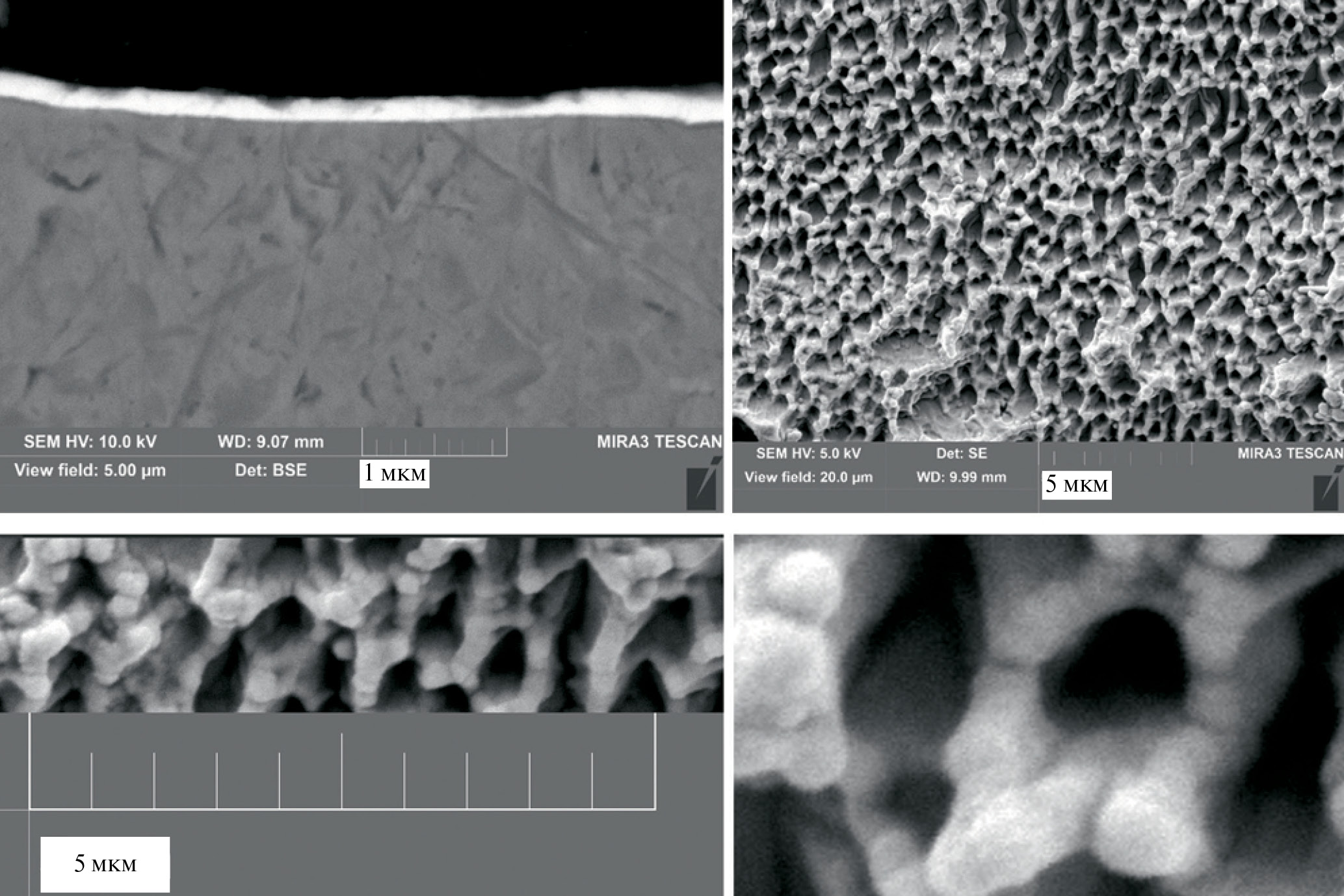 Как видно, формируется наноструктурированный каталитический слой на микронразмерной структуре Ti-подложки. Толщина самого каталитического слоя в данном случае составляет около 0.3 мкм.