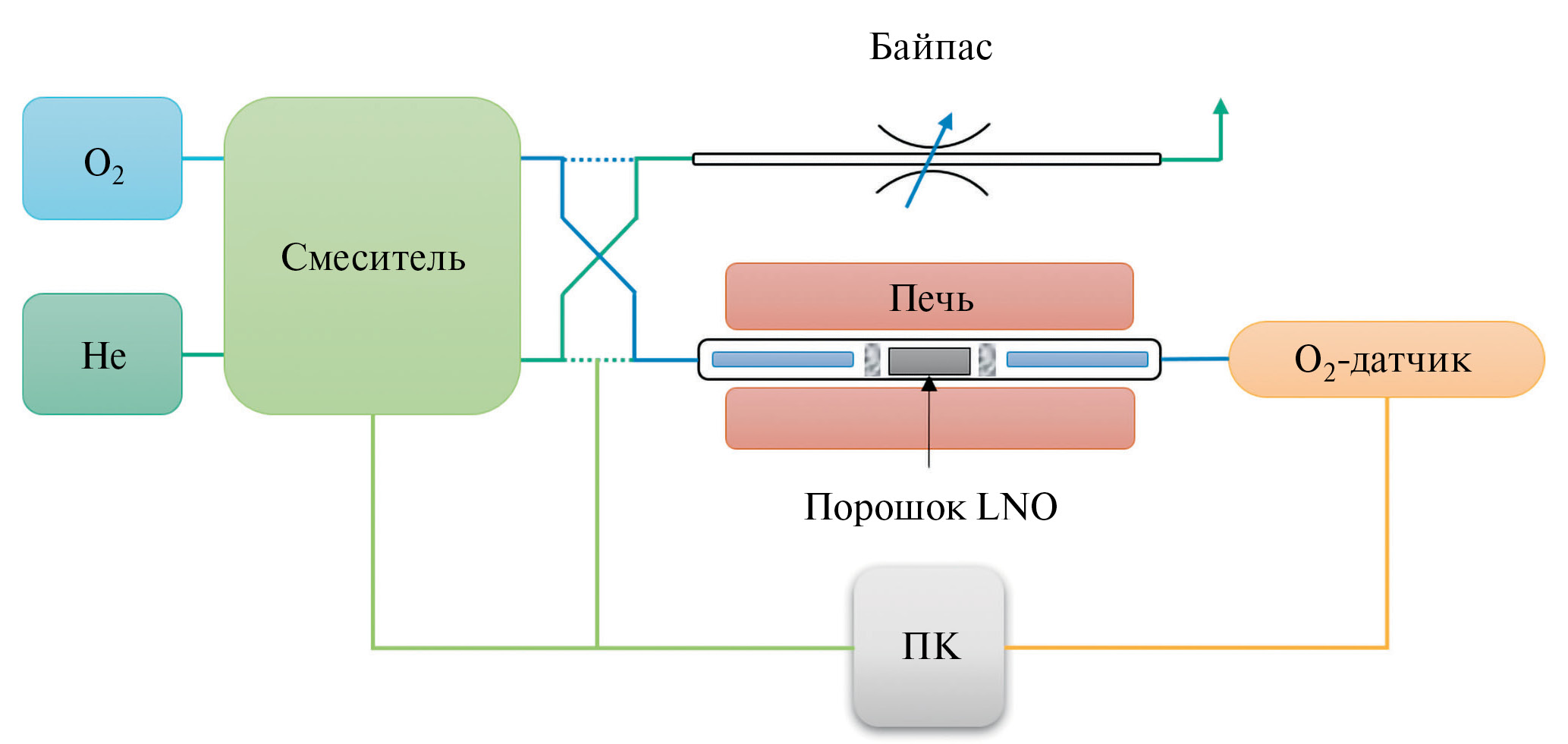 Для определения зависимости кислородной нестехиометрии от парциального давления кислорода при различных температурах использовали метод КРВК, схема установки приведена на рис. 1.