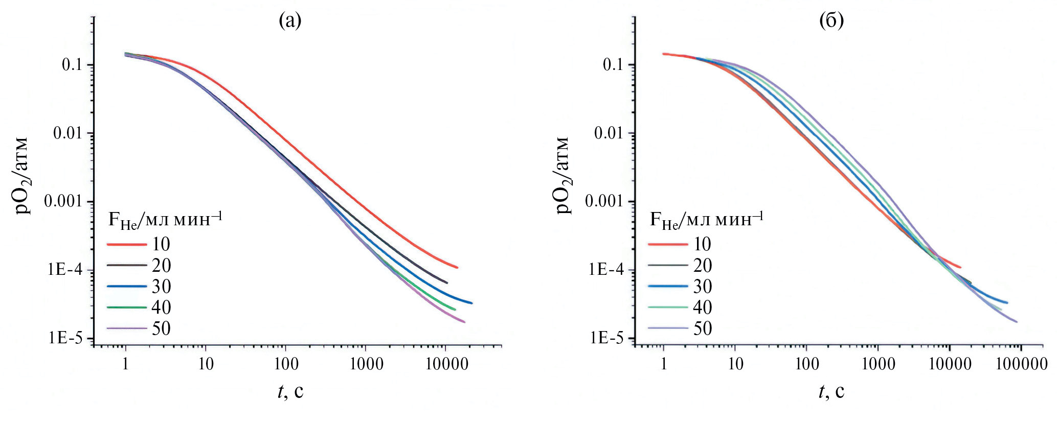 Как видно из рис. 4, полученные данные допускают аффинное преобразование при нормировании времени на скорость расхода гелия, и, следовательно, режим выделения кислорода из LNO при данных условиях (вплоть до FHe = 20 мл мин−1) является квазиравновесным: