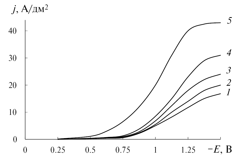 Рис. 1. Потенциодинамические зависимости выделения КЭП никель-кобальт-оксид алюминия в хлоридном электролите. Температура электролита, °С: 1 – 20; 2 – 30; 3 – 40; 4 – 50; 5 – 60.