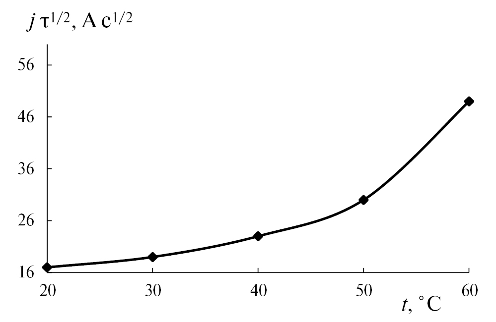 С целью дальнейшего изучения кинетики процесса выделения на катоде КЭП никель-кобальт-оксид алюминия на основе хронопотенциограмм были построены зависимости величины произведения j τ1/2 от плотности тока j при разных значениях температуры электролита (рис. 3). Для исключения влияния естественной конвекции были выбраны значения j, когда τ составляло не более 40…60 с [21].