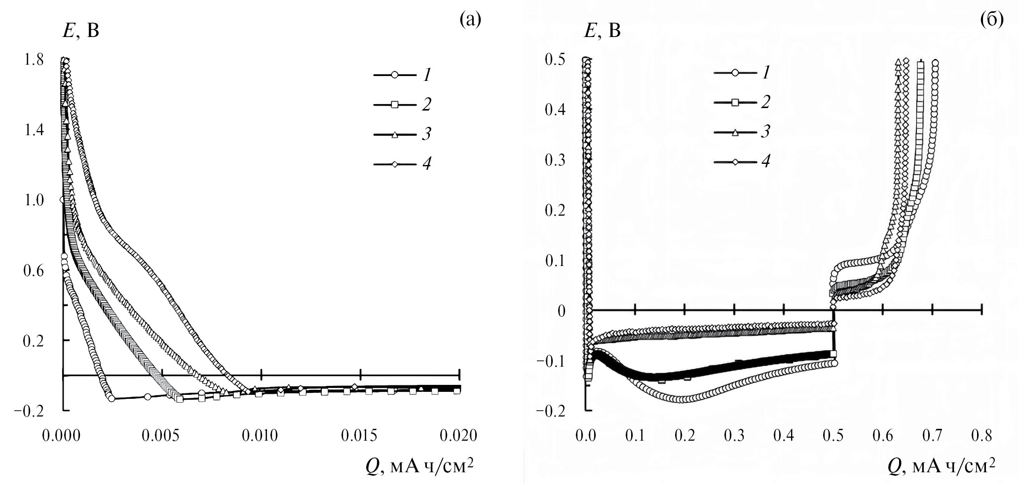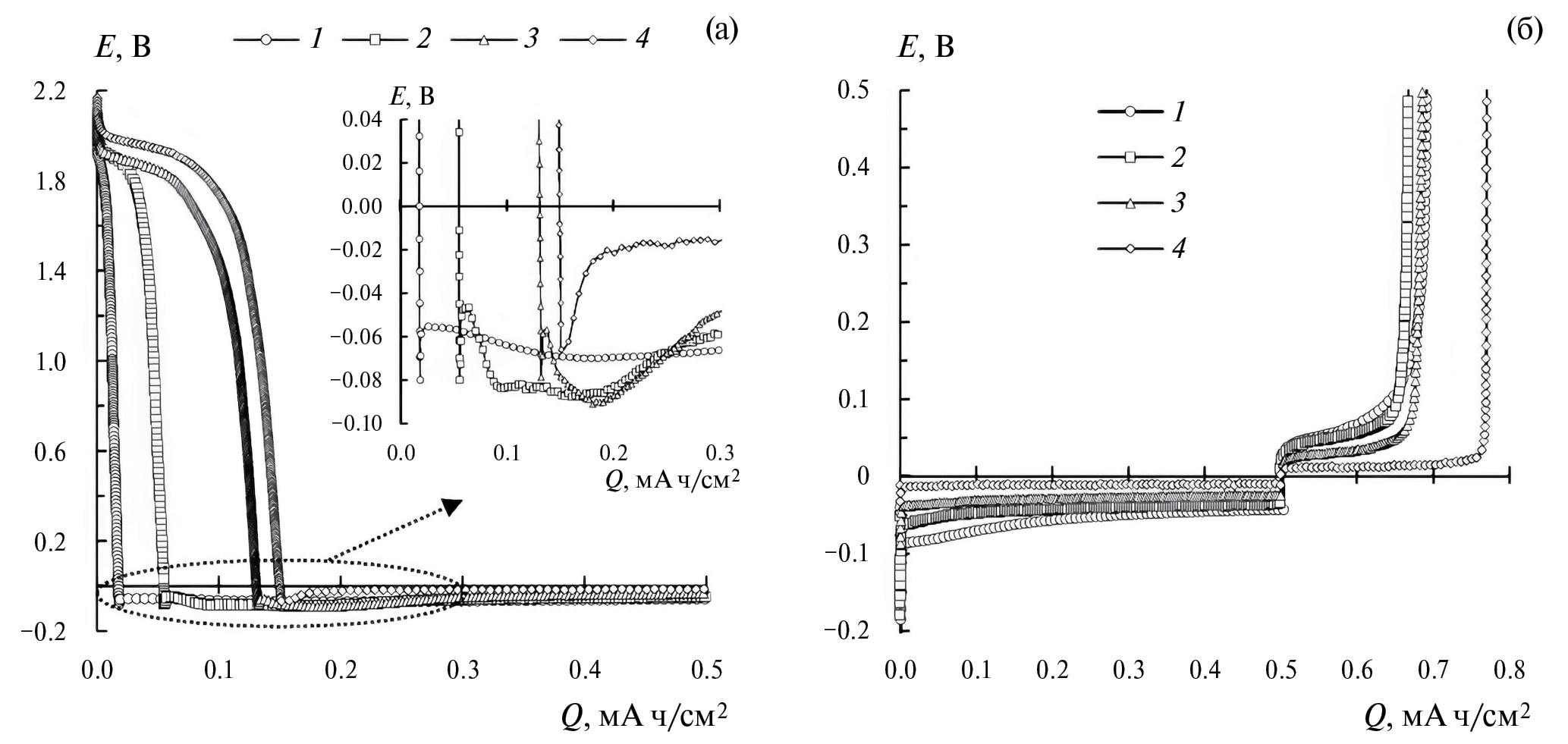 Условия циклирования: i = 0.2 мА/см2; Qкатод. ос. = 0.5 мА ч/см2.
