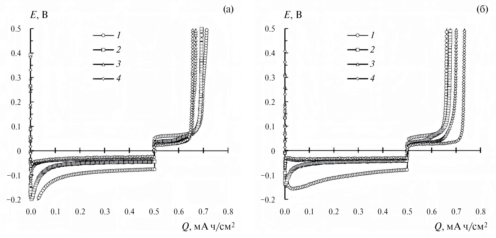 При анодной поляризации потенциалы рабочих электродов быстро увеличивались, затем стабилизировались и после полного анодного растворения лития вновь быстро возрастали (рис. 1б). Величины потенциалов стационарных участков хронопотенциограмм коррелируют с температурой ячеек – с увеличением температуры потенциалы стационарных площадок уменьшались.