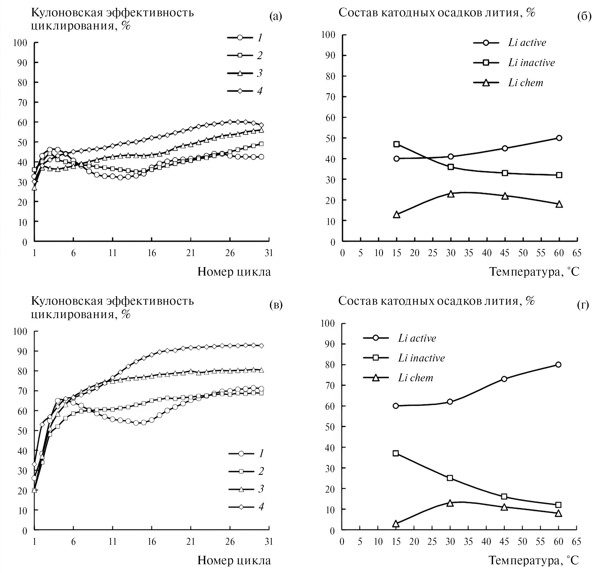 Рис. 3. Влияние температуры на кулоновскую эффективность (а, в) и состав катодных осадков лития (б, г) при катодно-анодном циклировании электрода из нержавеющей стали при различных температурах: 1 – 15°С, 2 – 30°С, 3 – 45°С, 4 – 60°С. а, б – в 1М растворе LiClO4 в сульфолане. в, г – в 1М растворе LiClO4 в сульфолане, насыщенном 0.25m Li2Sn.