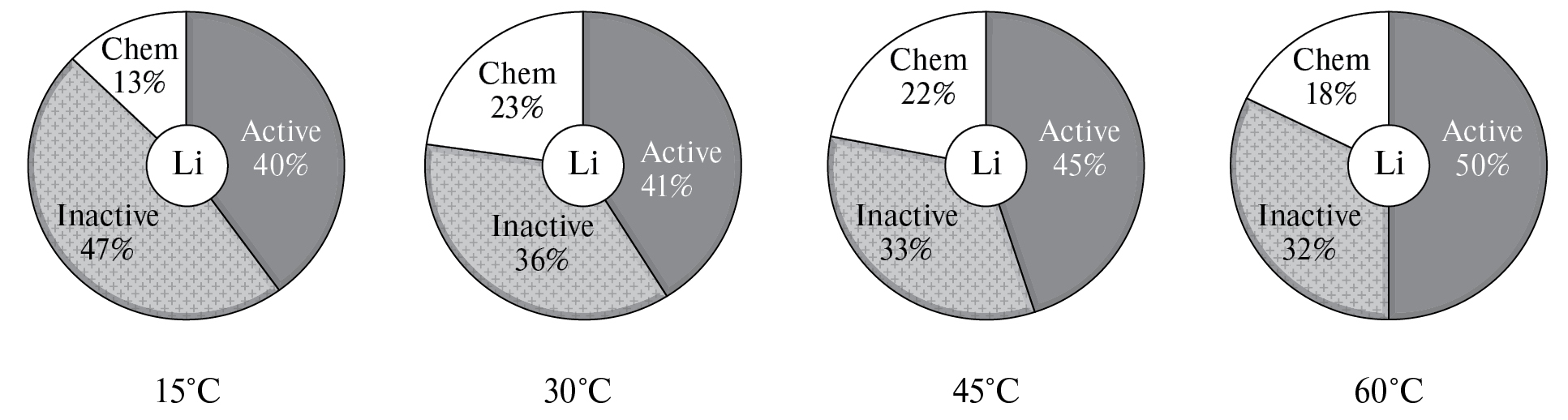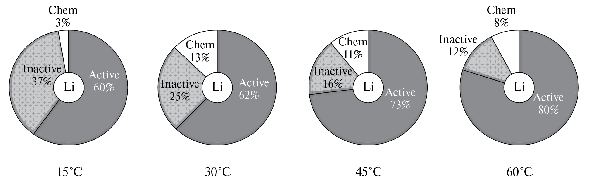 С увеличением температуры увеличиваются эффективность циклирования лития, количество компактного лития и уменьшается количество электрохимически неактивного (“мертвого”) лития.