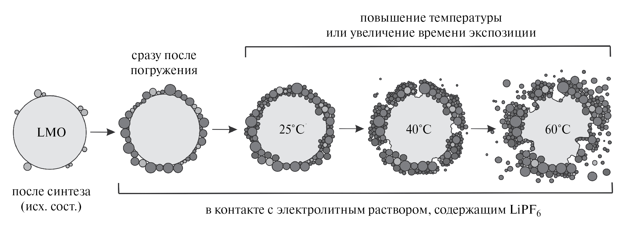 Целью данной работы было изучение химических взаимодействий между LMO и стандартным электролитным раствором (1 M LiPF6 в смешанном растворителе этиленкарбонат/диметилкарбонат (EC/DMC) (1 : 1, мас.)), в интервале температур 25–60°С, с использованием комплекса взаимодополняющих расчетных и экспериментальных методов. На основании полученных результатов предложена модель формирования на межфазной границе первичного интерфейсного слоя (в бестоковых условиях), объясняющая характерные особенности деградации электродов на основе LMO.