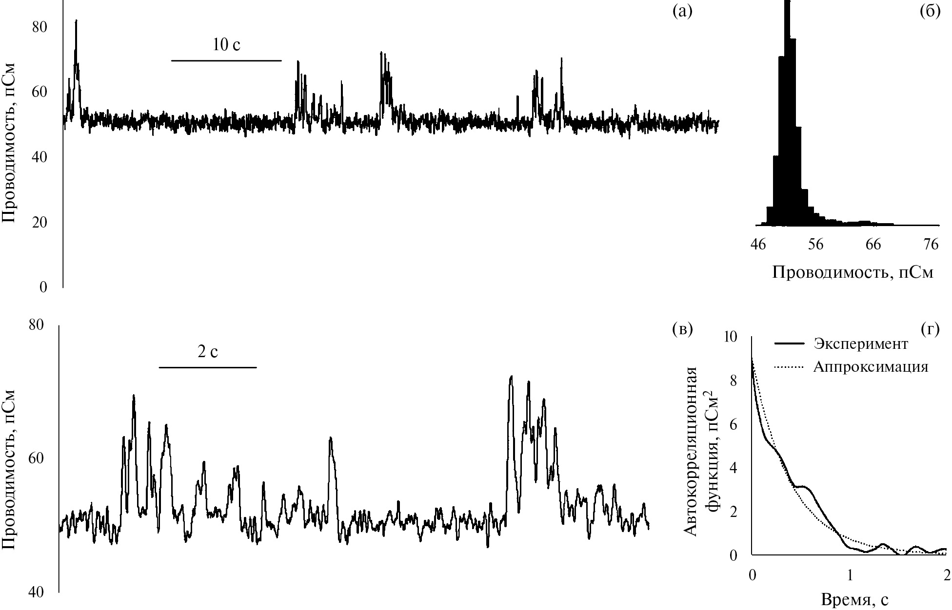 Рис. 5. Флуктуации проводимости азолектиновых мембран в 0.1 М KCl с добавкой 26 мкМ F68: (a) трек, (б) гистограмма (показан локальный максимум в районе 60 пСм, максимум гистограммы приходится на 28 пСм), (в) участок трека в увеличенном масштабе, (г) автокорреляционная функция проводимости, рассчитанная по экспериментальным данным и приближенная экспонентой. Напряжение на мембране 25 мВ.