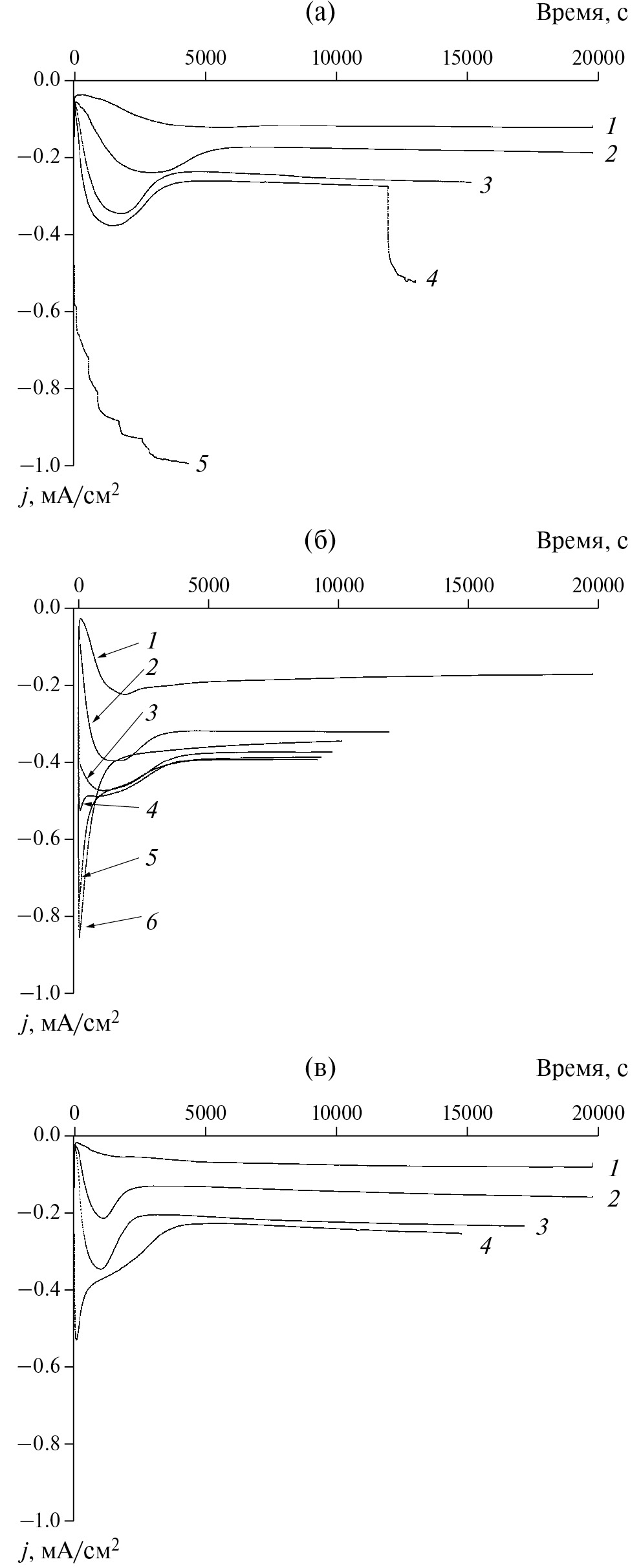 Рис. 4. Эволюция транзиентов плотности тока от потенциала для электроосаждения лития на электрод из меди. (а) Электролит без добавок ПАВ; (б) с добавкой C₁₆Me₃Br; (в) с добавкой C₁₆PyBr. Потенциалы: (а) 1 – –0.03 В, 2 – –0.04 В, 3 – –0.05 В, 4 – –0.055 В, 5 – –0.065 В; (б) 1 – –0.03 В, 2 – –0.04 В, 3 – –0.05 В, 4 – –0.055 В, 5 – –0.07 В, 6 – –0.09 В; (в) 1 – –0.03 В, 2 – –0.04 В, 3 – –0.05 В, 4 – –0.09 В.