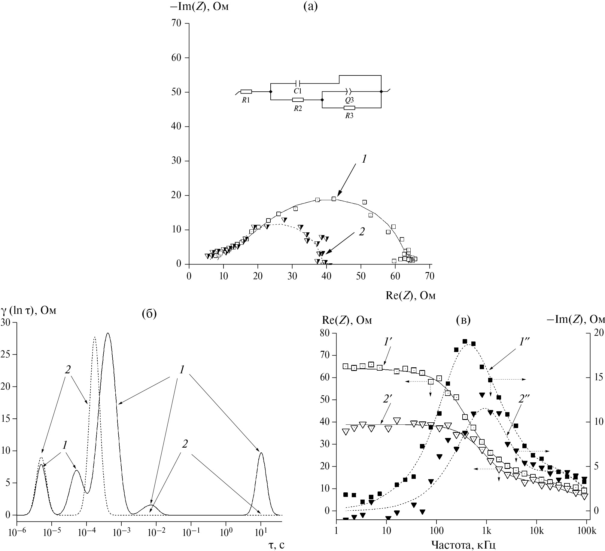 Мы начнем со сравнения результатов анализа импедансных спектров методом распределения времен релаксации с результатами анализа, проведенного традиционным методом эквивалентных схем. На рис. 1а приведены типичные спектры электрохимического импеданса, измеренные на осадке из металлического лития, электроосажденного из базового электролита без добавления поверхностно–активных веществ (ПАВ) (кривая 2) и из базового электролита в присутствии одного из использованных ПАВ, бромида гексадецилпиридиния (кривая 1). На первый взгляд годографы импеданса имеют схожую форму и могут быть описаны одной и той же эквивалентной схемой, также приведенной на рис. 1а. Указанная эквивалентная схема является типичной для фарадеевских процессов, осложненных массопереносом, и представляет собой модифицированную схему Эршлера–Рэндлса со слегка измененным смыслом основных параметров.