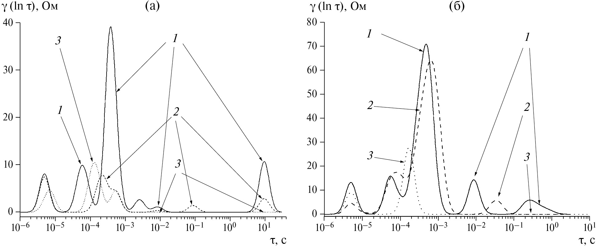Рис. 2. Спектры времен релаксации, полученные обработкой импедансных данных для осадков металлического лития, электроосажденных на (а) медный и (б) литиевый электроды в присутствии бромида гексадецилпиридиния (кривые 1) и бромида цетилтриметиламмония (кривые 2), а также в базовом электролите в отсутствии ПАВ (кривые 3).