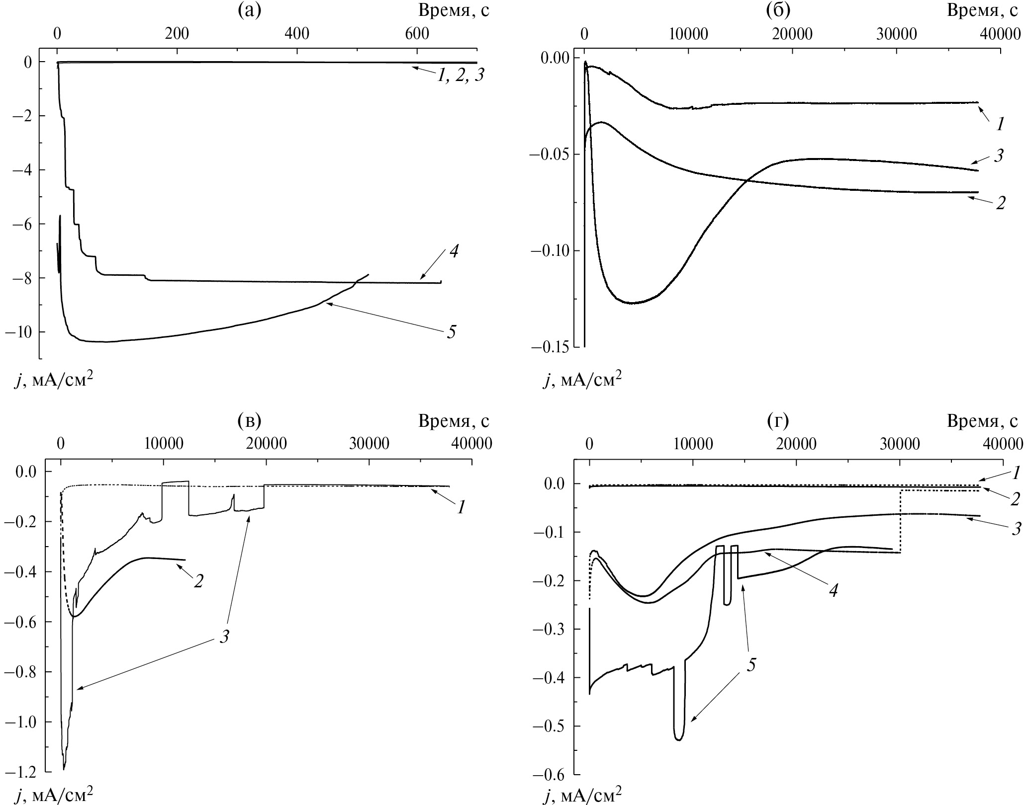Рис. 4. Транзиенты плотности тока, измеренные в процессе осаждения металлического лития: (а, б) на медный электрод в электролите с добавкой декалина, (в) на медный электрод в электролите с добавкой перфтордекалина, (г) на литиевый электрод в электролите с добавкой декалина (кривые 1, 2) и с добавкой перфтордекалина (кривые 3, 4, 5). Потенциалы: (а, б) 1 – –0.03 В, 2 – –0.025 B, 3 – –0.04 B, 4 – –0.6 B, 5 – –0.1 B; (в) 1 – –0.03 B, 2 – –0.06 B, 3 – –0.095 B; (г) 1 – –0.085 B, 2 – –0.06 B, 3 – –0.03 B, 4 – –0.06 B, 5 – –0.1 B.