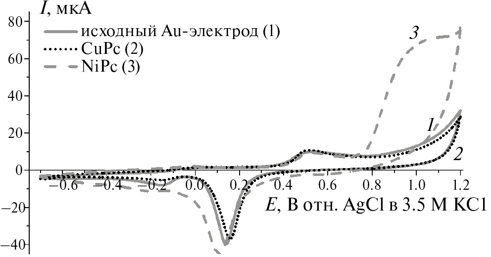 Как видно из рис. 2, на немодифицированном золотом электроде (1), а также на электроде, модифицированном CuPc (2), OH–-ионы электрокаталитически не окисляются в представленном диапазоне потенциалов. Электрокатализ на электроде, модифицированном NiPc, проявляется в многократном увеличении тока в данной области потенциалов (кривая 3 на рис. 2). При потенциале +1.2 В относительно электрода сравнения наблюдается увеличение тока, представляющее собой предел диапазона потенциалов.