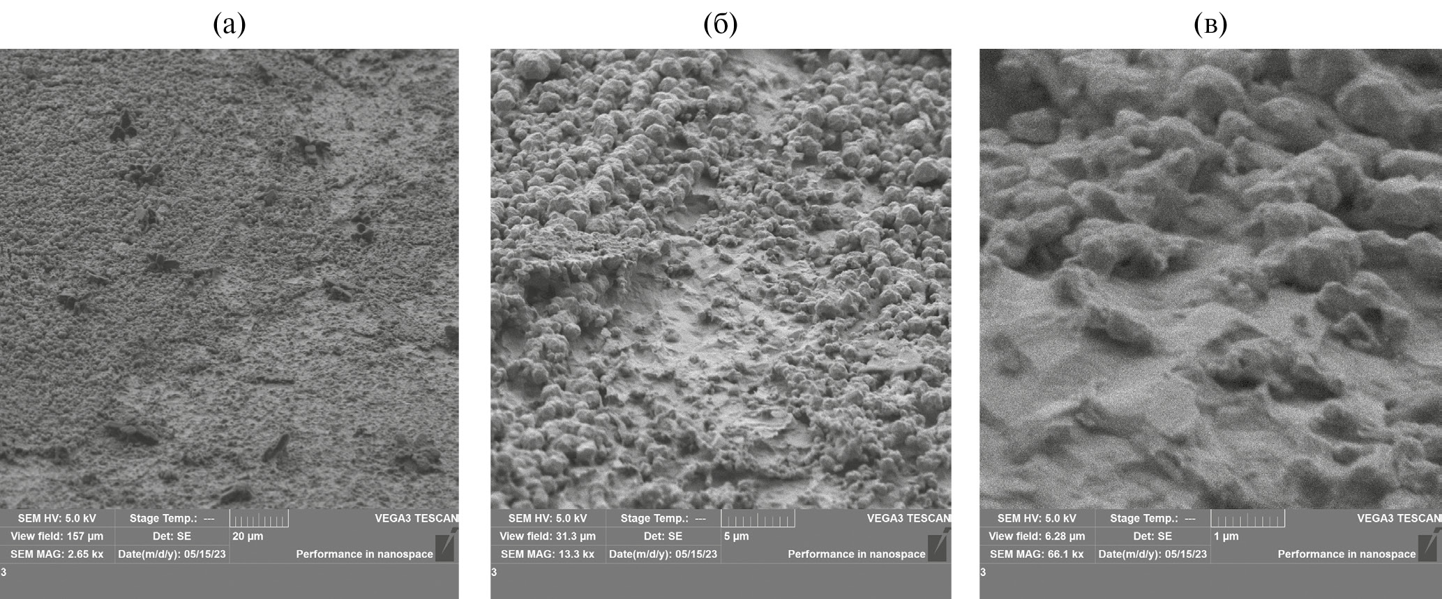 Рис. 4. СЭМ-изображения поверхности модифицированного NiPc золотого электрода, сделанные при различном увеличении: (а) 20 мкм; (б) 5 мкм; (в) 1 мкм