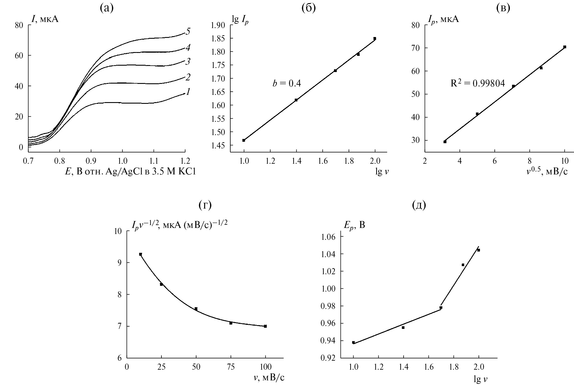Рис. 5. (а) Анодные ветви вольтамперограммы окисления гидроксид-иона на золотом электроде, модифицированном NiPc в Na2HPO4/NaOH буферном растворе при pH 12 (25.0°C, фоновый электролит – 0.1 M TBAP) при различных скоростях сканирования: 10 мВ/с (1), 25 мВ/с (2), 50 мВ/с (3), 75 мВ/с (4), 100 мВ/с (5). (б) Зависимость lgIp – lgν для анодных токов NiPc. (в) Зависимость Ip – ν0.5 для анодных токов NiPc. (г) Соотношение между Ipv–1/2 и ν. (д) Соотношение между Ep и lgν