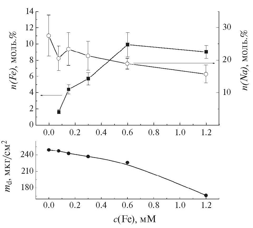 По мере увеличения содержания феррата(VI) в растворе происходит снижение md при одинаковом пропущенном заряде (рис. 4), что указывает на уменьшение выходов по току. Содержание железа n(Fe) в образцах бирнессита, определенное методом РСМА, быстро возрастает до ~10 мол. % при увеличении с(Fe) до 0.6 мМ, после чего рост замедляется (рис. 4). Соотношение Fe/Mn возрастает в ~3 раза по сравнению с соотношением в растворе осаждения. Содержание натрия n(Na) при этом снижается. Во всех образцах обнаруживается незначительное количество K на уровне 0.1 мол. %. С учетом ранее проведенного анализа недопированного бирнессита [15], состав полученных образцов можно представить как K0.001NaxFeyMnO2×0.54H2O, где x = (0.28–0.16), y = (0.016–0.1).