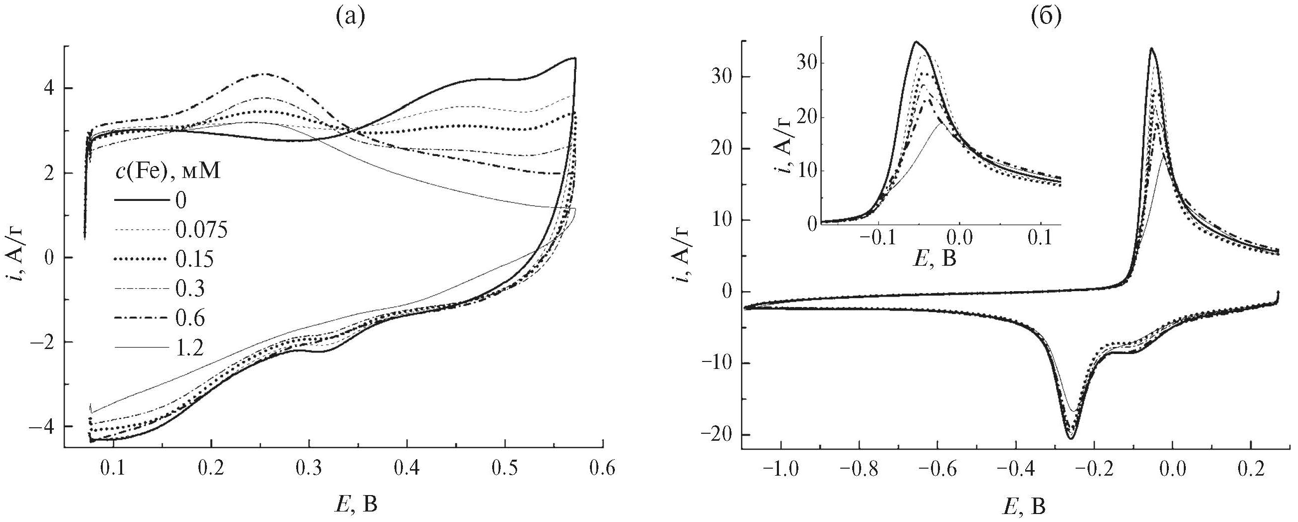 Перезаряжение в области отрицательных потенциалов характеризуется наличием хорошо выраженных максимумов при –0.25 на катодной и –0.04 В на анодной ветвях вольтамперограммы (рис. 7б, c(Fe) = 0 мМ)). Допирование железом приводит к снижению их высоты и некоторому смещению потенциала на анодной ветви к более положительным значениям (рис. 7б, врезка). Поскольку эти максимумы отвечают процессу перезаряжения, сопряженному с интеркаляцией-деинтеркаляцией слабо связанных ионов Na [32] в межслоевое пространство, то можно заключить, что допирование железом приводит к уменьшению их количества, как и сильно-связанных. Возможной причиной этого может быть как рост разупорядочения (рис. 3), способствующий снижению выигрыша в энергии при интеркаляции и повышению лабильности катионов, так и уменьшение доли центров MnIV, способных перезаряжаться [37]. Последнее может приводить к снижению общего заряда в анодной области при высоком содержании железа (рис. 7а, c(Fe) = 1.2 мМ).