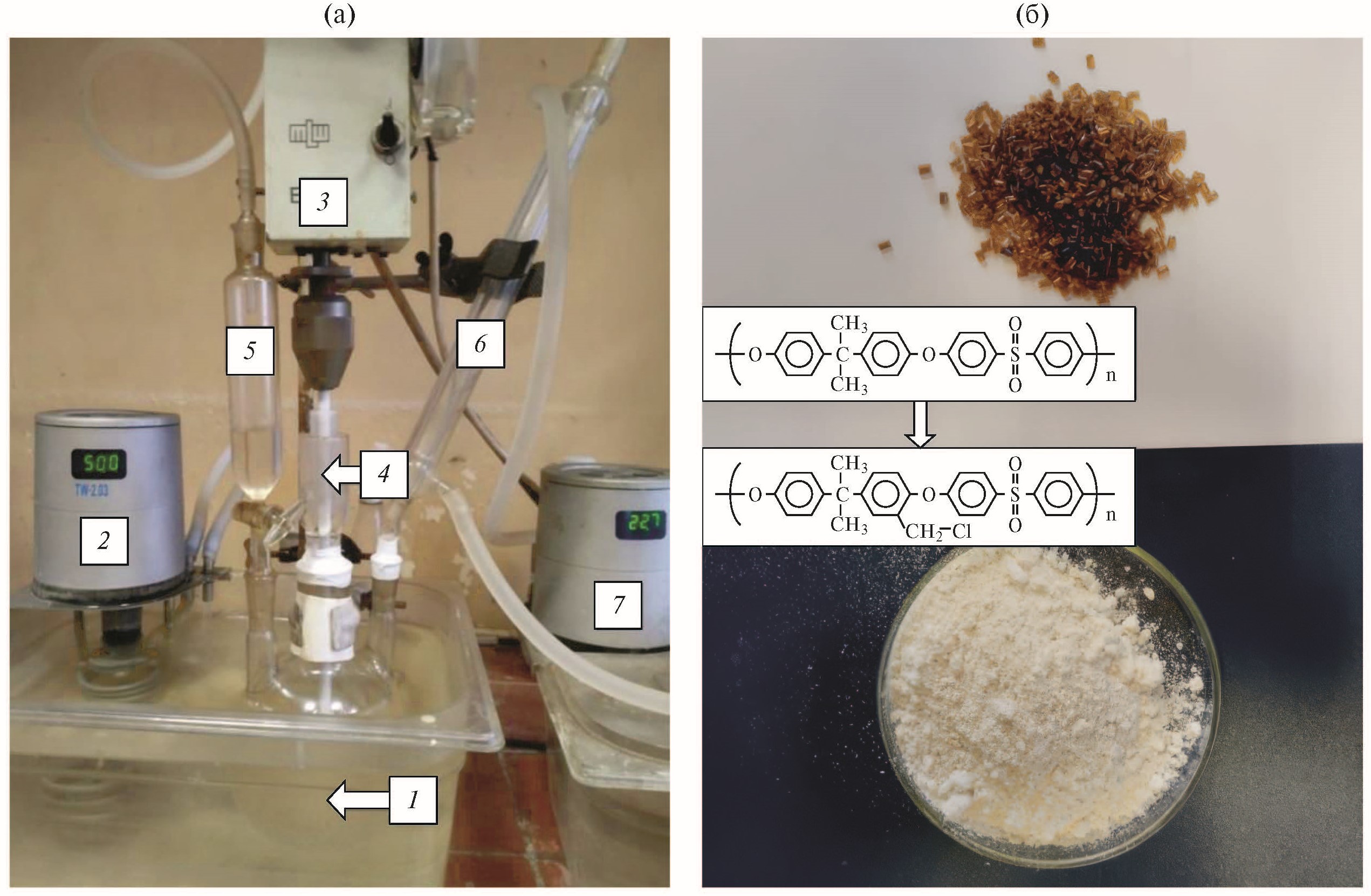 Рис. 1. Хлорметилирование полисульфона: (а) – лабораторная установка для хлорметилирования; (б) – исходный полисульфон ПСФ-150 и его хлорметилированное производное