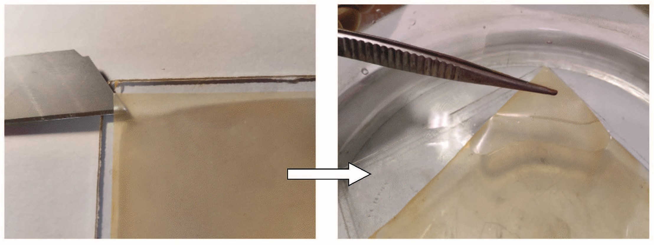 Пленка кватернизованного полисульфона характеризуется хорошей адгезией к стеклянной подложке и в сухом состоянии достаточно хрупкая. Стеклянную подложку с высушенной пленкой погружали в ванну с водой. По истечении 2–3 ч пленка кватернизованного полисульфона хорошо отделяется от подложки без повреждений и становится эластичной (рис. 2).