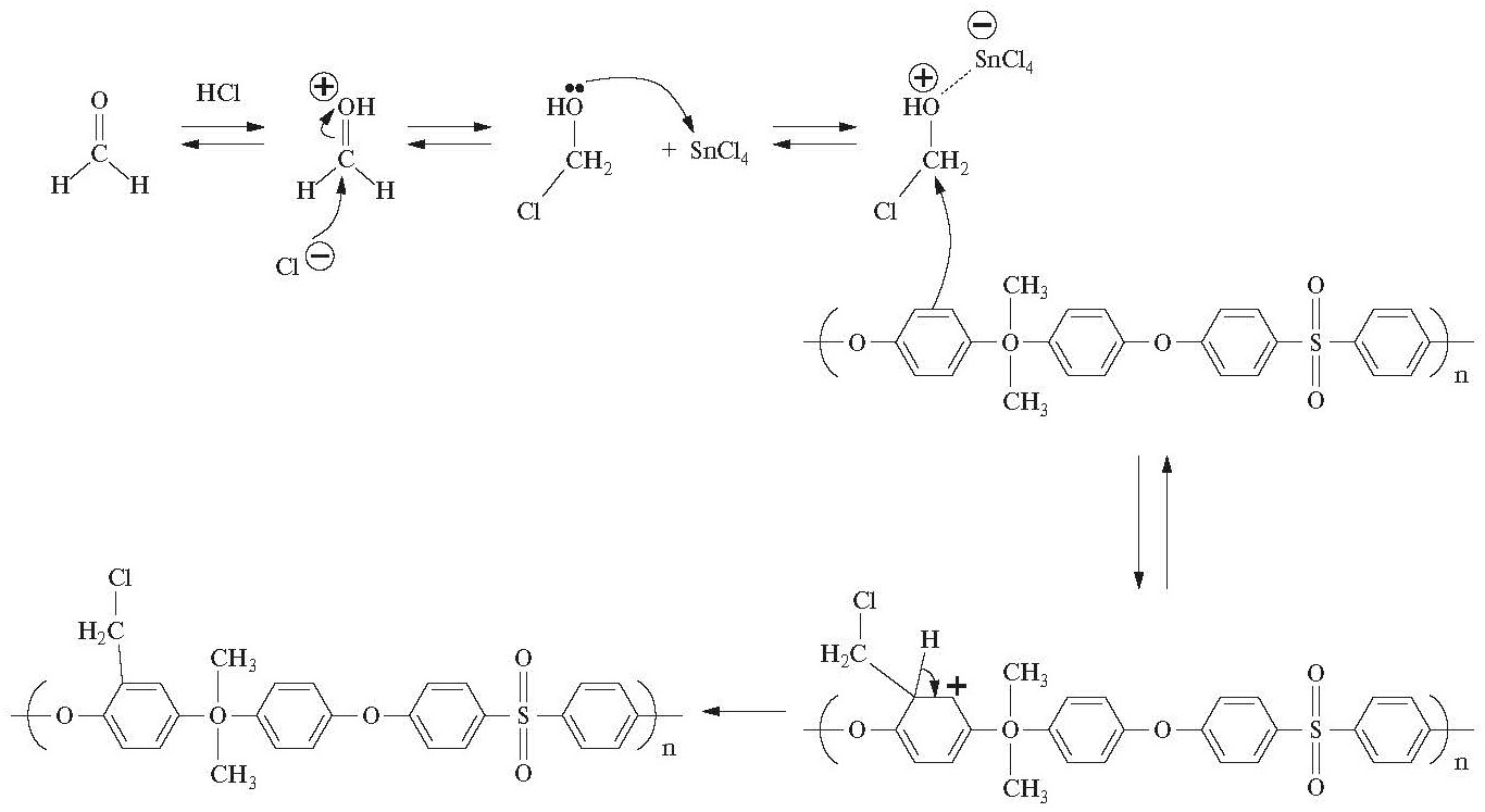 Реакция хлорметилирования полисульфона протекает по двухстадийному механизму электрофильного присоединения-отщепления в ароматическом кольце (SEAr). Механизм реакции является одним из вариантов реакции Фриделя – Крафтса. Впервые хлорметилирование бензола реакцией с формальдегидом и хлоридом водорода в присутствии ZnCl2 (кислоты Льюиса) осуществил Г. Л. Бланк в 1923 г. Главный недостаток реакции Бланка – использование канцерогенного формальдегида и образование также канцерогенного побочного продукта реакции – дихлорметилового эфира.