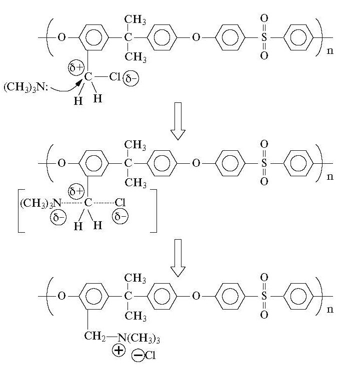 Кватернизация хлорметилированного полисульфона была осуществлена по реакции Меншуткина (1890 г.), суть которой заключается в алкилировании третичных аминов с образованием четвертичных аммониевых солей. Реакция с алкилгалогенидами может протекать по механизму бимолекулярного нуклеофильного замещения (SN2), рис. 5.