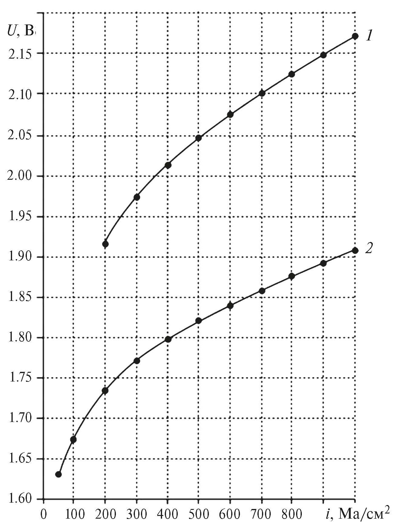 Рис. 6. Вольт-амперные характеристики электролизной ячейки с различными разделительными материалами: 1 – анионообменная мембрана на основе кватернизованного полисульфона; 2 – пористая диафрагма