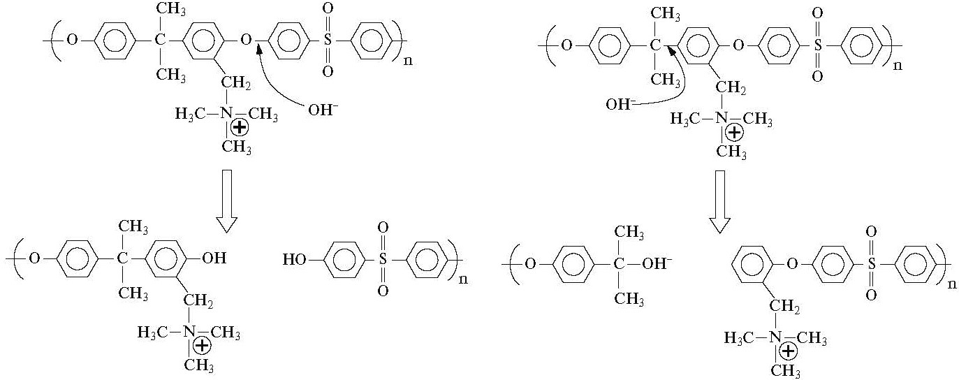 С точки зрения устойчивости кватернизация полисульфона может оказать негативное влияние на устойчивость полисульфона. Деградация может происходить как по основной цепи полимера по эфирной группе и четвертичному атому углерода (рис. 7), так и по привитой группе четвертичного амина (рис. 8). Первый путь деградации будет приводить к разрушению диафрагмы, второй – к потере анионообменных свойств.