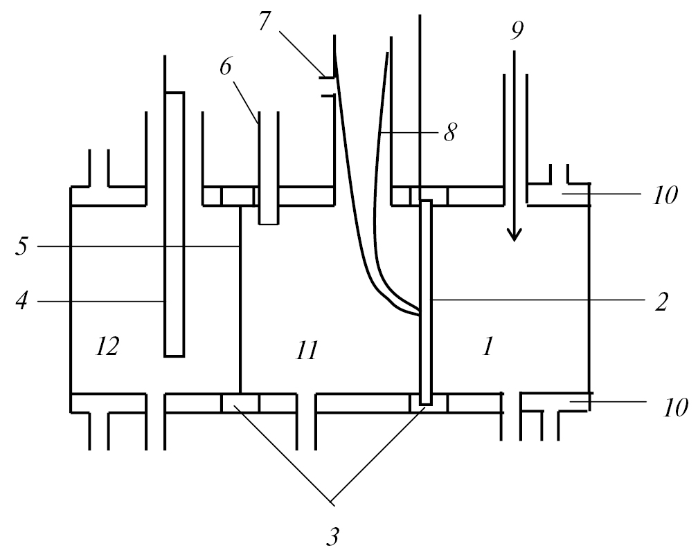 Рис. 1. Схематическое изображение ячейки-электролизера. 1 – газовая камера, 2 – ГДЭ, 3 – фторопластовые обоймы, 4 – платиновый противоэлектрод, 5 – катионообменная мембрана МФ-4СК-100, 6 – термометр, 7 – патрубок для отвода газообразных продуктов, 8 – капилляр Луггина, 9 – подача СО2 или инертного газа, 10 – термостатирующая рубашка, 11, 12 – катодная и анодная камеры.